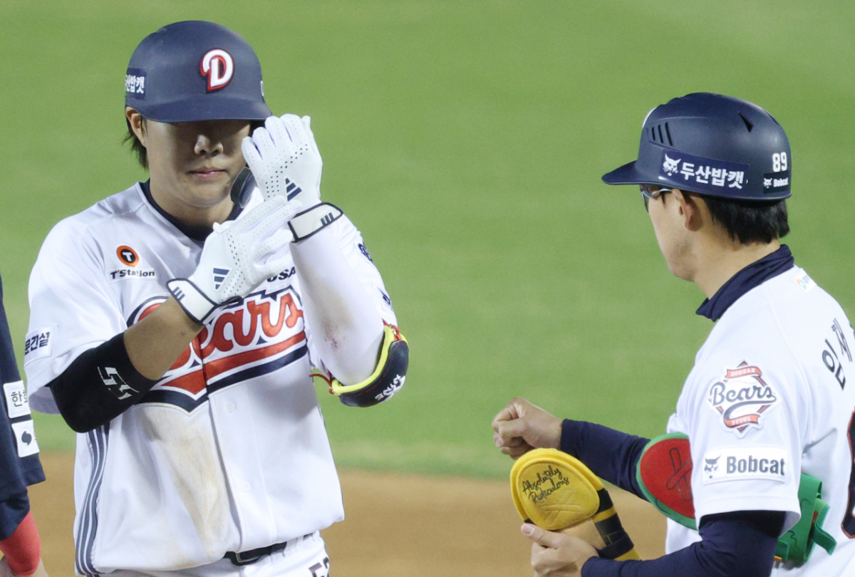 두산 빅준순이 4회말 2사 만루에서 2타점 적시타를 날리고 출루한 후 세리머니를 하고 있다.