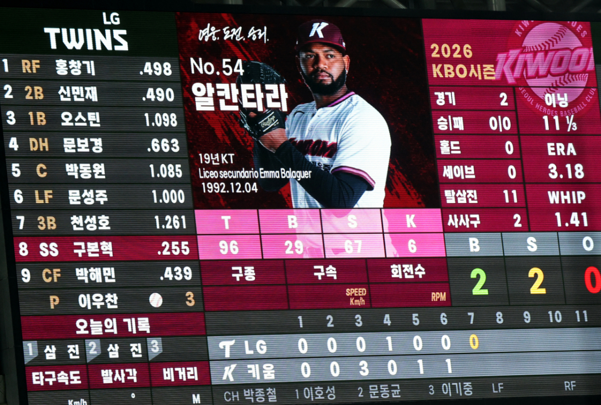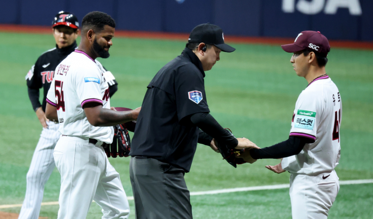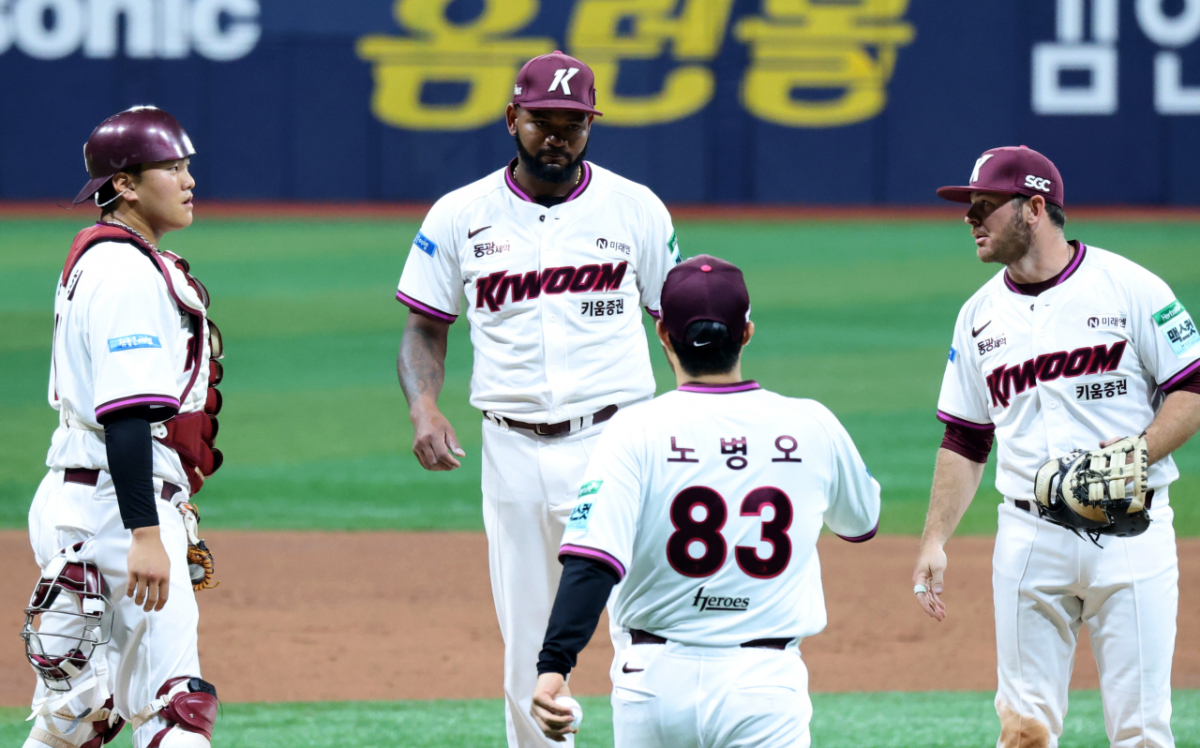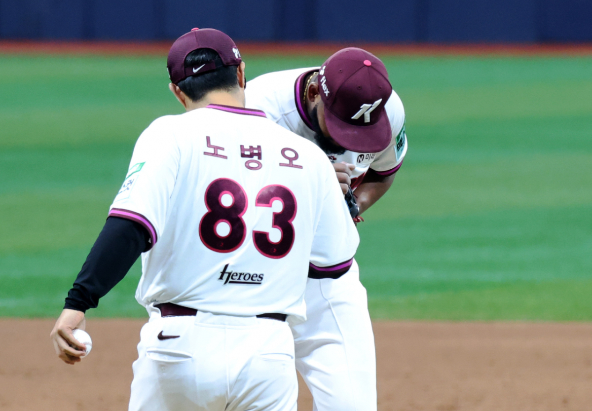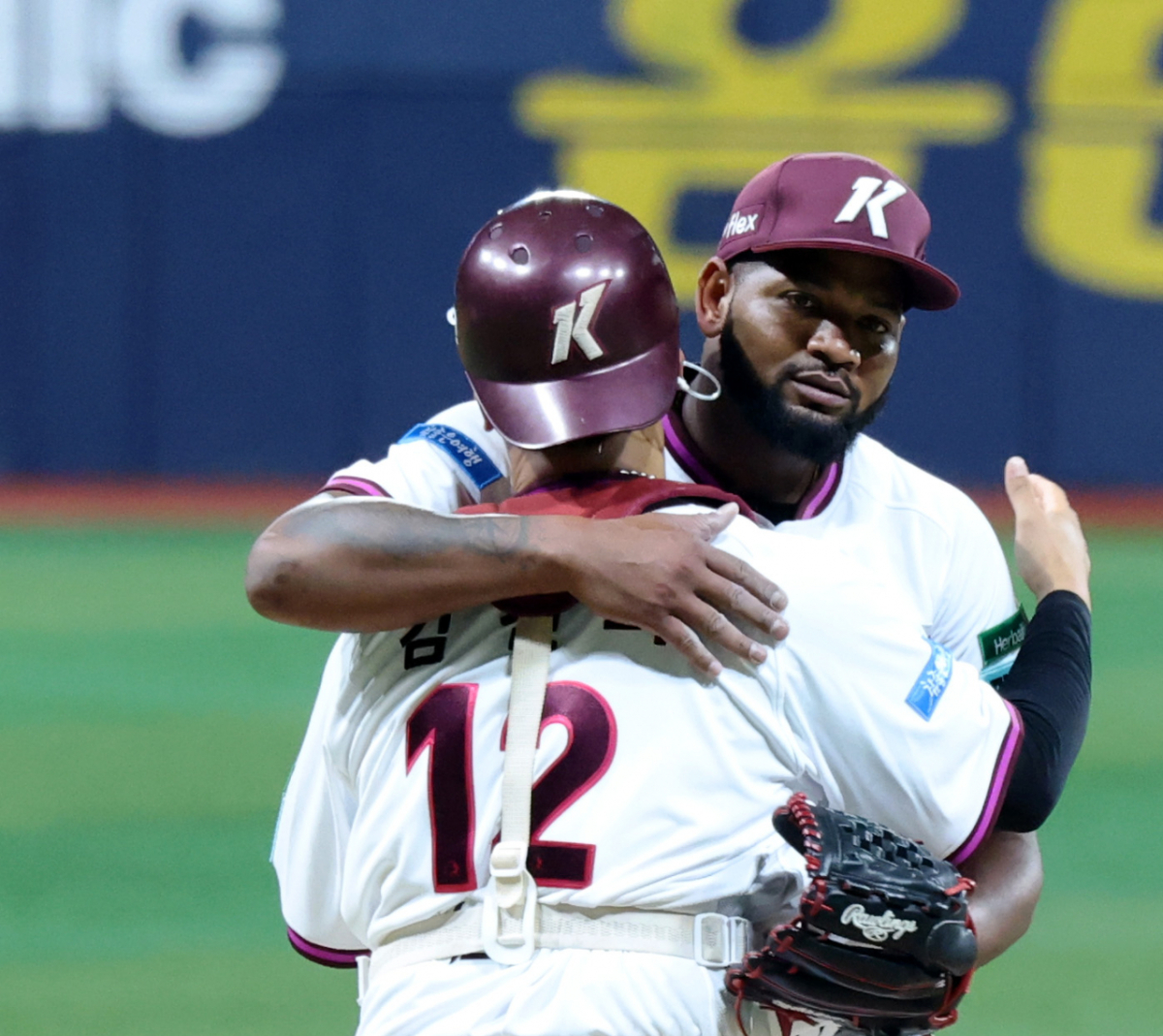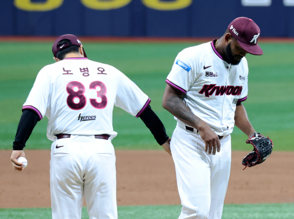키움 선발투수 알칸타라가 4일 고척스카이돔에서 열린 2026 KBO리그 키움히어로즈와 LG트윈스 경기 7회초 1사 후 투구수 96개에 이르자 유토로 교체됐다. 알칸타라는 포수 김건희와 포옹하며 마운드를 내려왔다. 그는 노병오 코치와 악수를 나누고 팬들에게 모자를 벗어 답례했다.