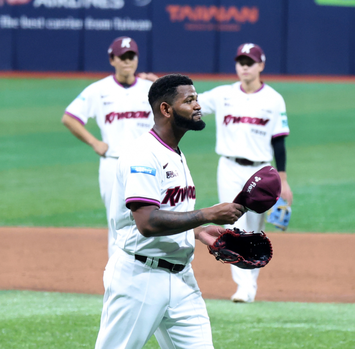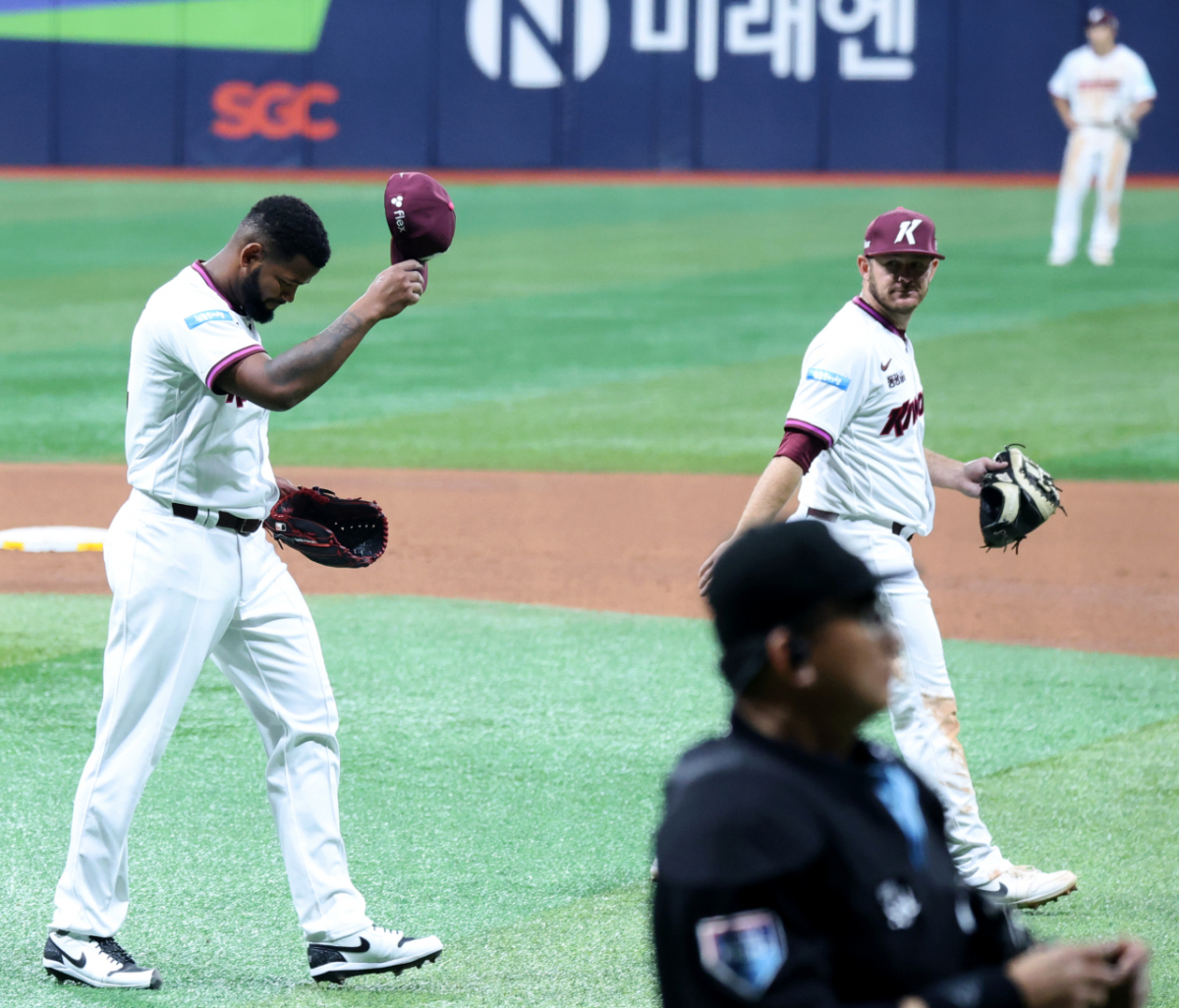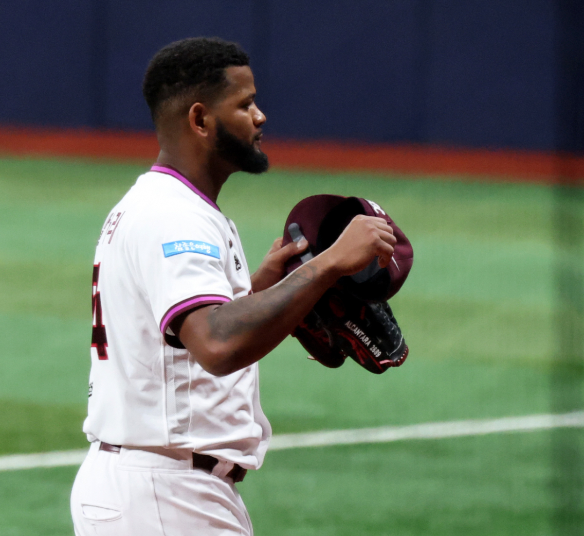 키움 선발투수 알칸타라가 4일 여척스카이돔에서 열린 2026KBO리그 키움히어로즈와 LG트윈스 경기 7회초 1사 후 투구수가 96개에 이르자 유토로 교체되고 있다. 202604.03.