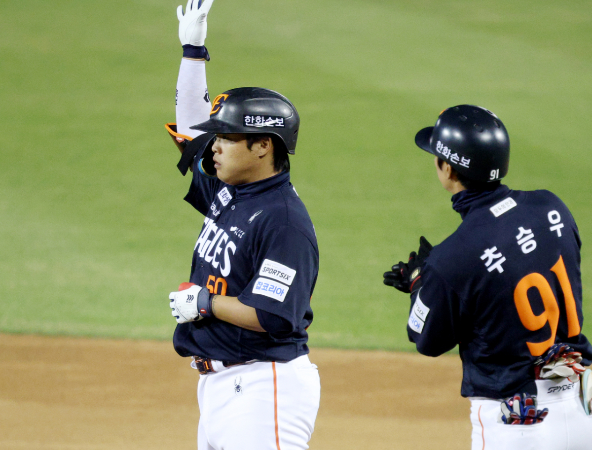 한화 강백호가 7회초 무사에서 좌전 안타로 출루한 후 세리머니를 하고 있다.