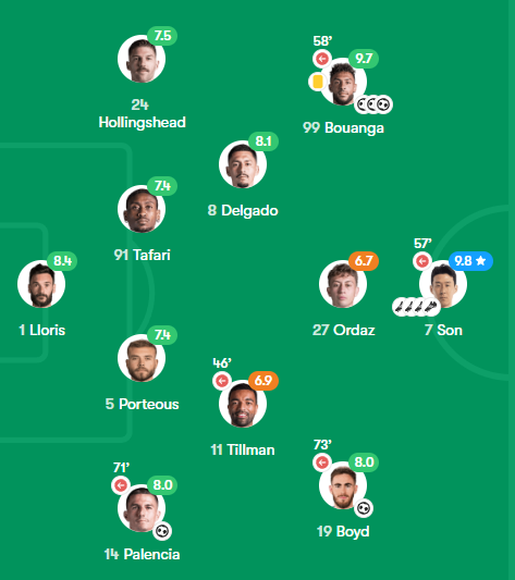 이날 LAFC는 4-2-3-1 포메이션을 가동했다. 손흥민이 최전방에 배치됐고, 부앙가, 오르다스, 보이드가 2선에 나섰다. 중원에는 델가도와 틸만이 자리했고, 수비는 홀링스헤드, 타파리, 포티어스, 팔렌시아가 구축했다. 골문은 요리스가 지켰다.