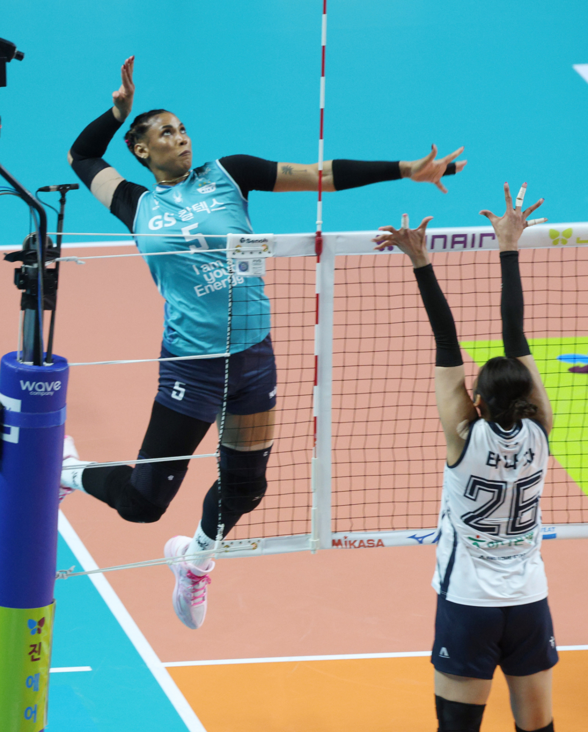 GS칼텍스 실바가 한국도로공사 타나차의 블로킹 위로 강스파이크를 날리고 있다.