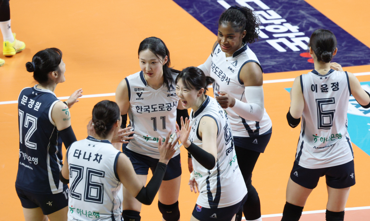 한국도로공사 강소휘가 결정적인 공격에 성공한 후 기쁨을 나누고 있다.