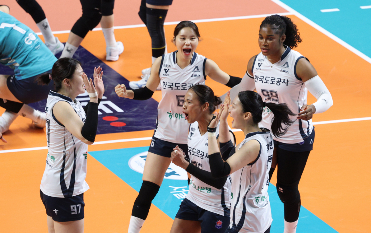 한국도로공사 타나차가 결정적인 공격에 성공한 후 환호하고 있다.