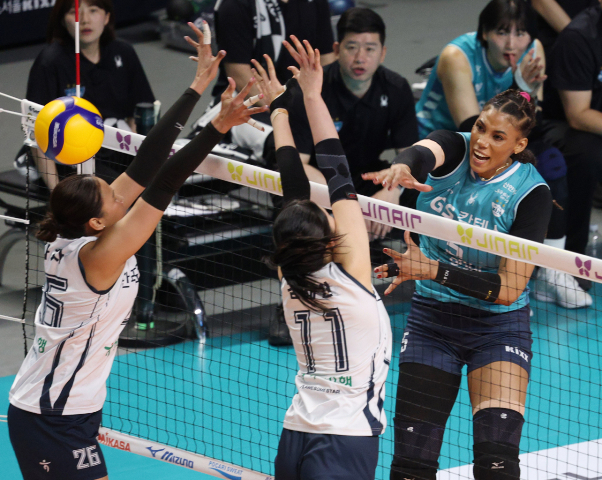 GS칼텍스 실바가 한국도로공사 타나차, 김세빈의 블로킹 위로 강스파이크를 날리고 있다.