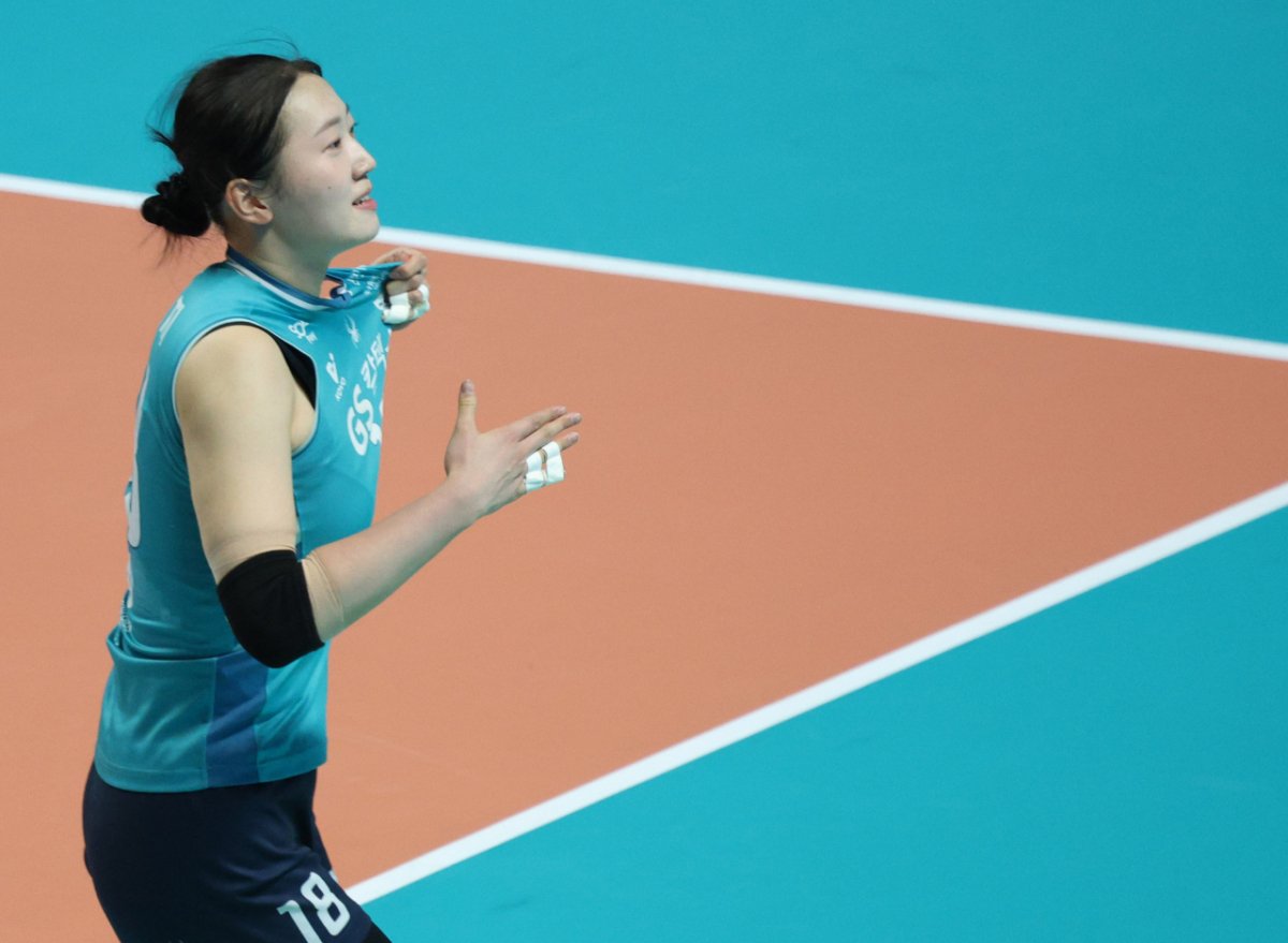 2025-2026 V-리그 포스트시즌 여자 프로배구 챔피언 결정전 3차전 GS칼텍스 대 한국도로공사 경기가 5일 서울 장충체육관에서 열렸다. GS칼텍스 권민지가 결정적인 블로킹에 성공했다. 권민지는 블로킹 성공 후 세리머니를 했다.