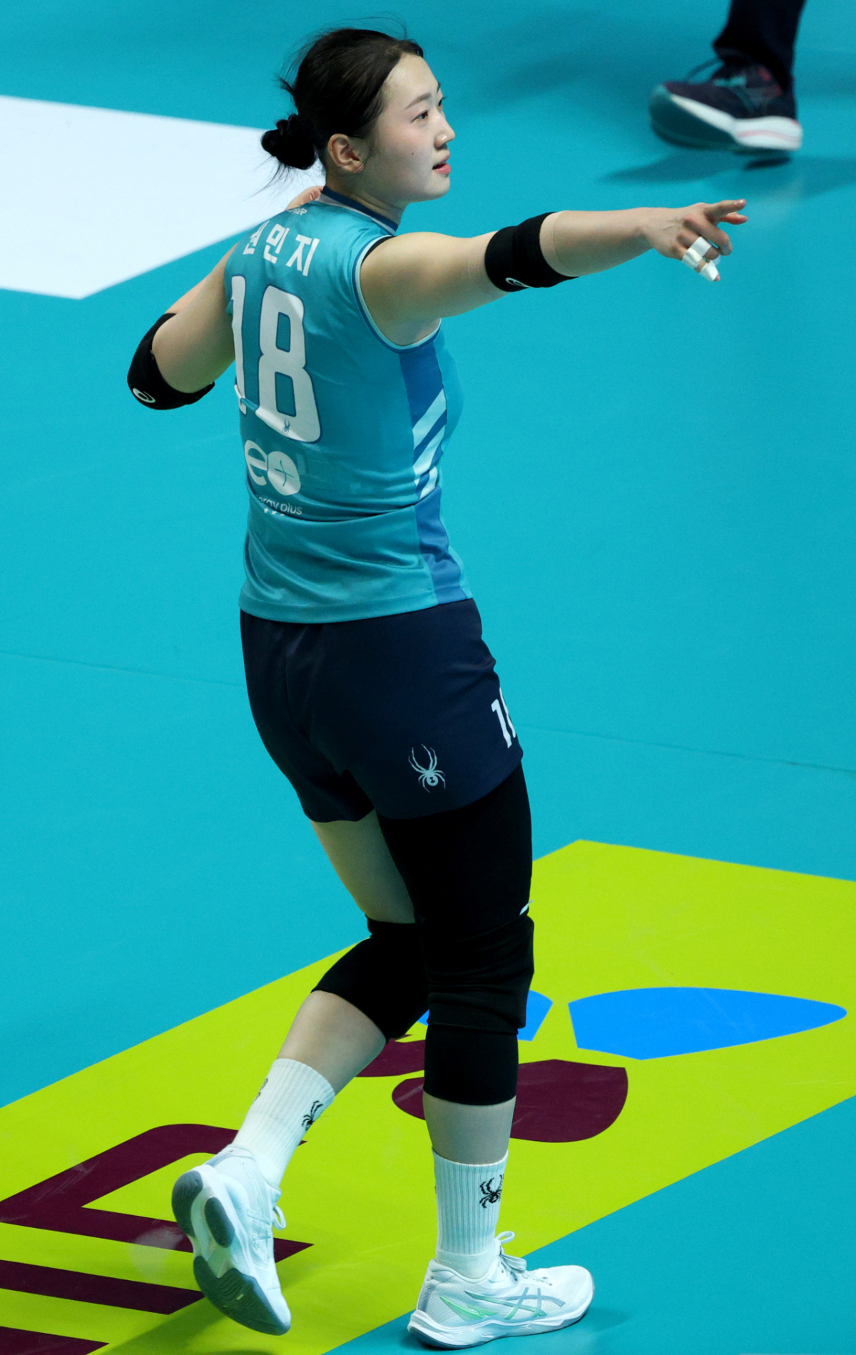GS칼텍스 권민지가 결정적인 블로킹에 성공한 후 세리머니를 하고 있다.