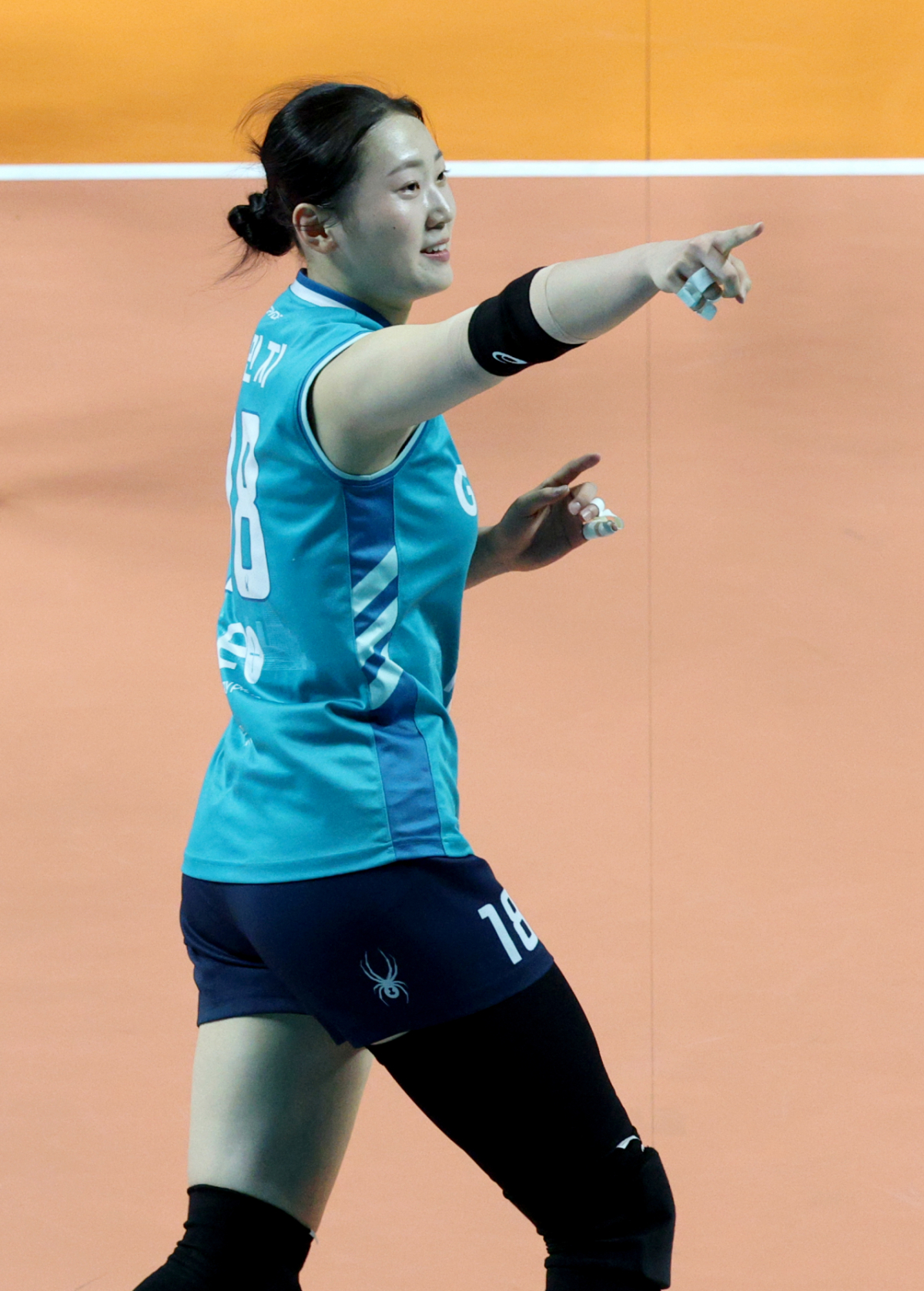 GS칼텍스 권민지가 결정적인 블로킹에 성공한 후 세리머니를 하고 있다.