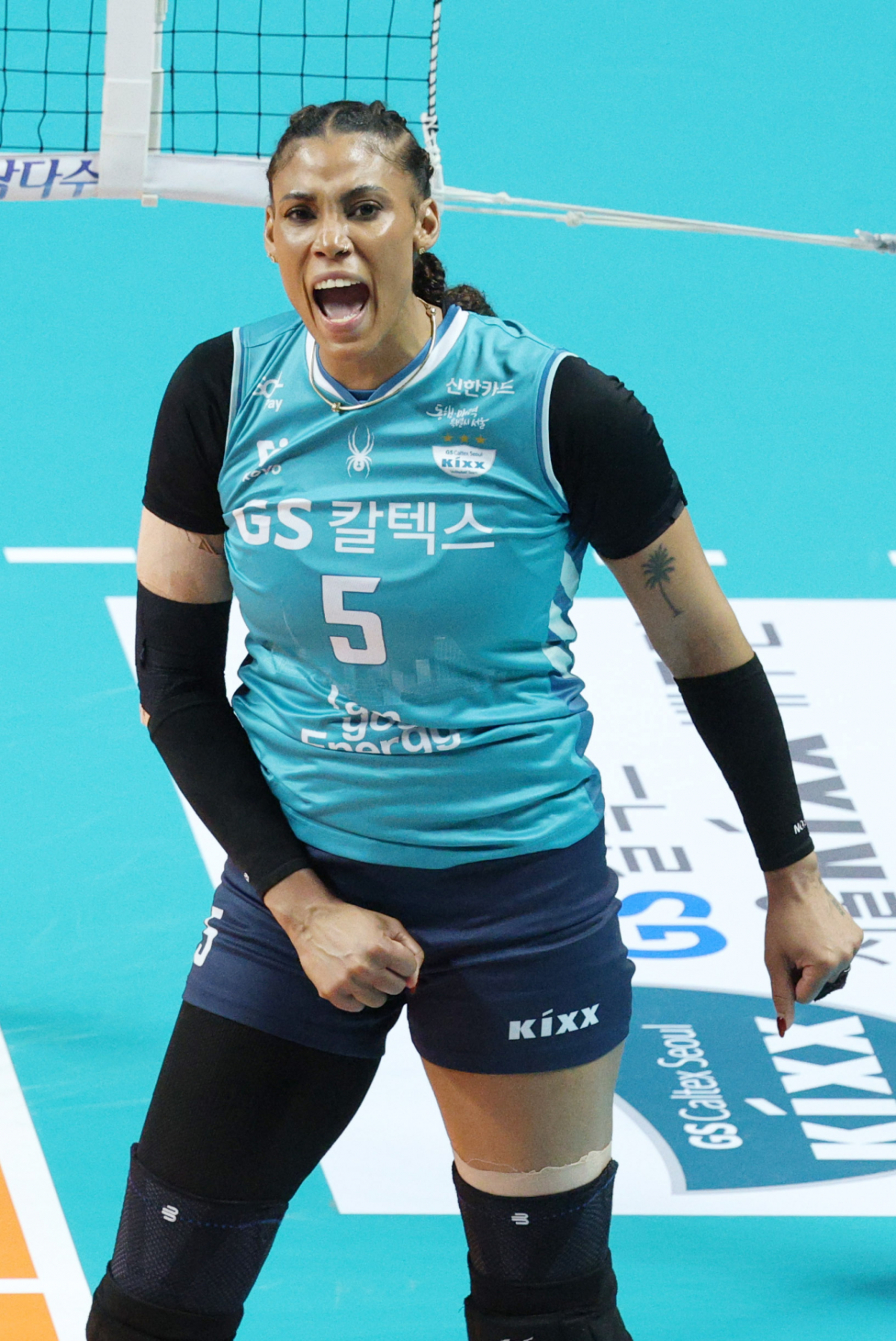 GS칼텍스 실바가 결정적인 공격에 성공한 후 환호하고 있다.
