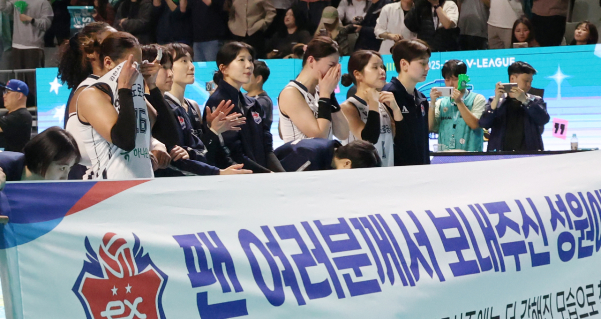 한국도로공사 선수들이 GS칼텍스에 패하며 준우승에 그친 후 눈물을 흘리며 응원단에 인사하고 있다.