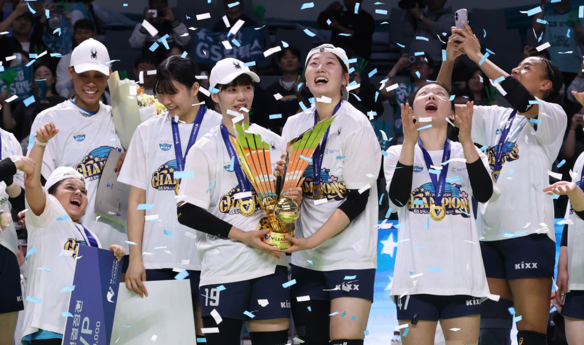 2025-2026 V-리그 포스트시즌 여자 프로배구 챔피언 결정전 3차전 GS칼텍스 대 한국도로공사 경기가 5일 서울 장충체육관에서 열렸다. 실바를 비롯한 GS칼텍스 선수들이 우승을 차지했다. 이들은 시상대에 올라 기쁨을 나눴다.