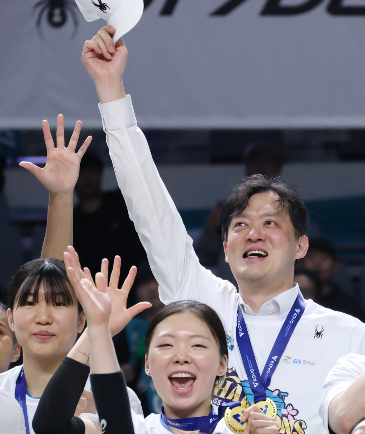 2025-2026 V-리그 포스트시즌 여자 프로배구 챔피언 결정전 3차전 GS칼텍스 대 한국도로공사 경기가 5일 서울 장충체육관에서 열렸다. GS칼텍스가 우승을 차지했다. 이영택 감독을 비롯한 선수단이 시상대에서 기쁨을 나눴다.