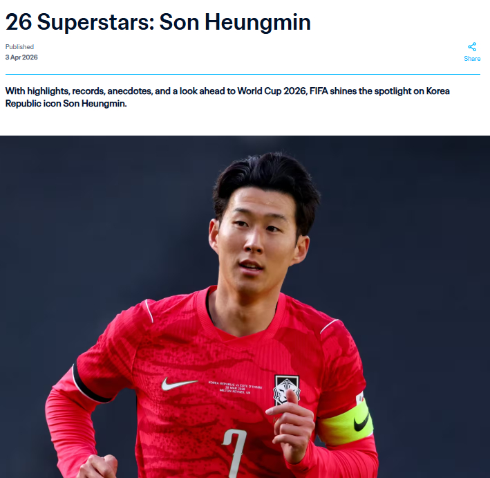 대한민국 축구 국가대표팀 주장 손흥민(34·LAFC)이 국제축구연맹(FIFA) 선정 2026 FIFA 북중미 월드컵 '슈퍼스타'에 이름을 올렸다.