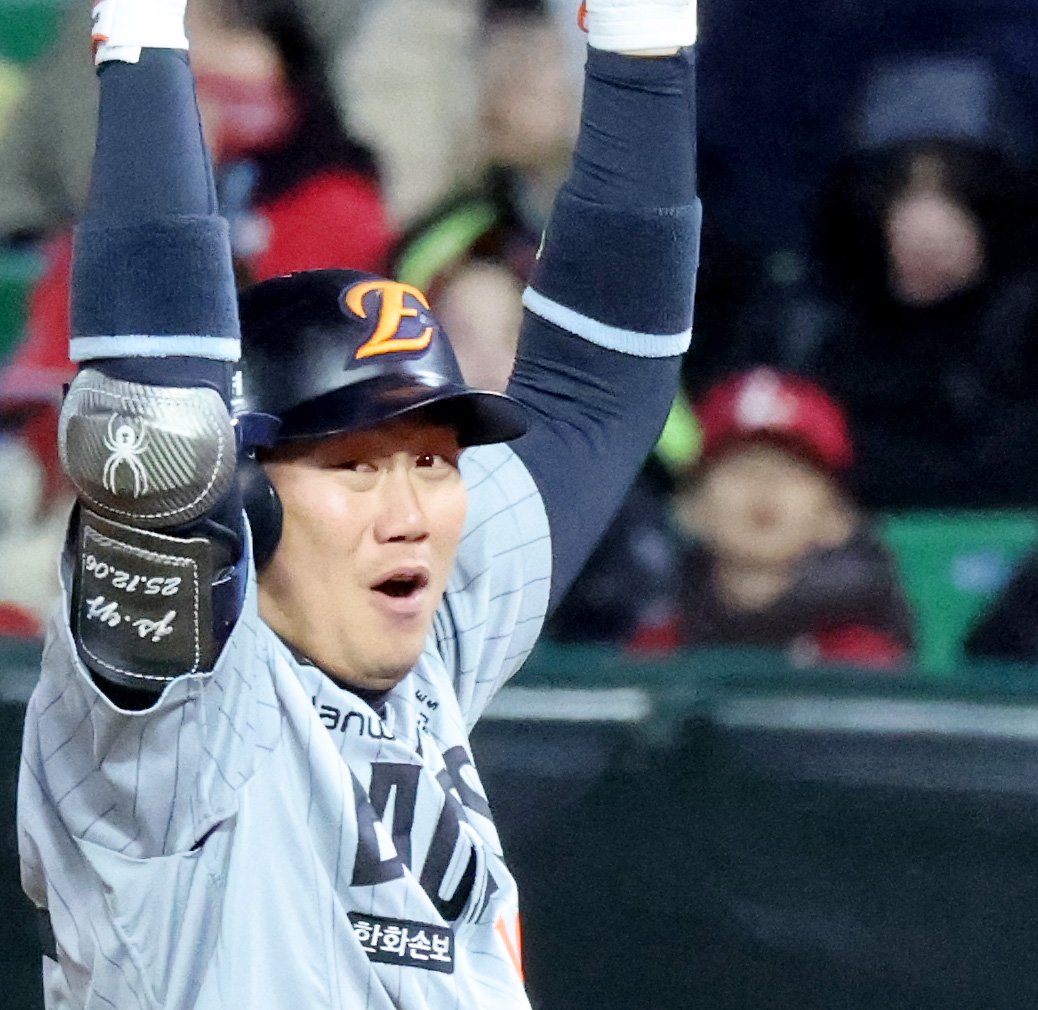 한화 하주석이 7일 랜더스필드에서 열린 2026KBO리그 한화이글스와 SSG랜더스 시즌 첫 경기 3회초 2사 만루에서 2타점 적시타를 터트린 후 환호하고 있다.