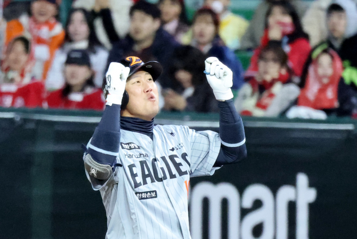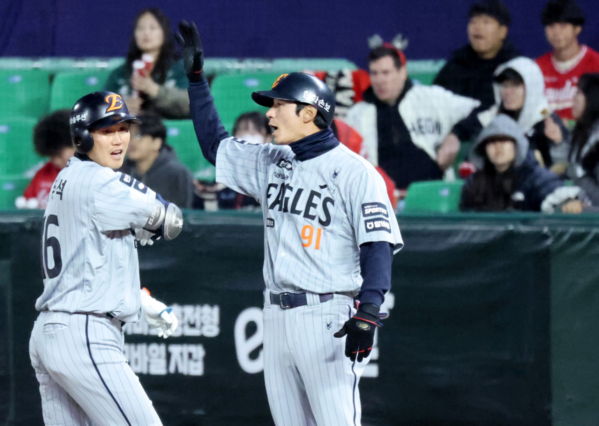 한화 하주석이 7일 랜더스필드에서 열린 2026KBO리그 한화이글스와 SSG랜더스 시즌 첫 경기 3회초 2사 만루에서 2타점 적시타를 터트린 후 환호하고 있다. 2026.04.07.