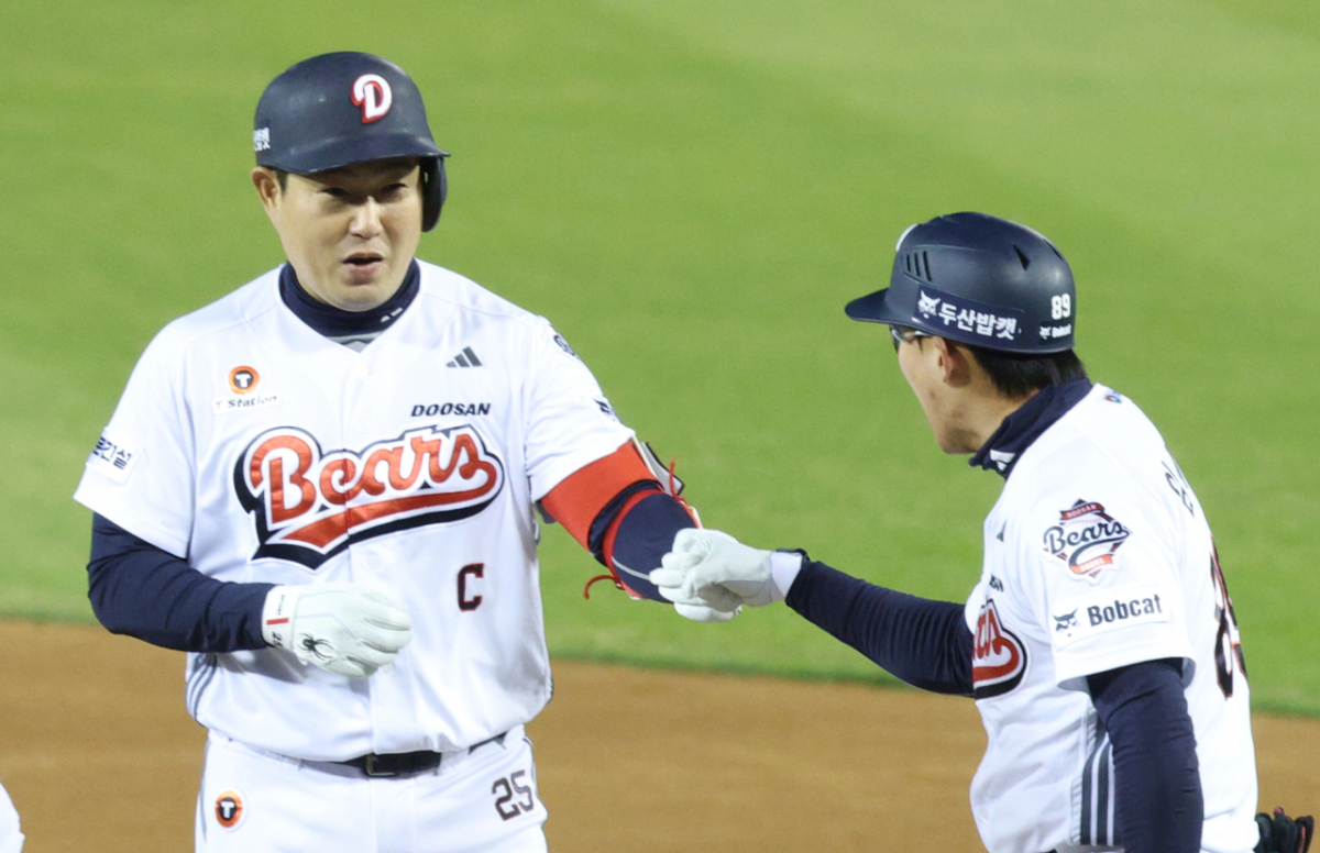 두산 양의지가 4회말 무사 1루에서 촤전 안타를 날리고 출루한 후 1루 코치의 환영을 받고 있다.