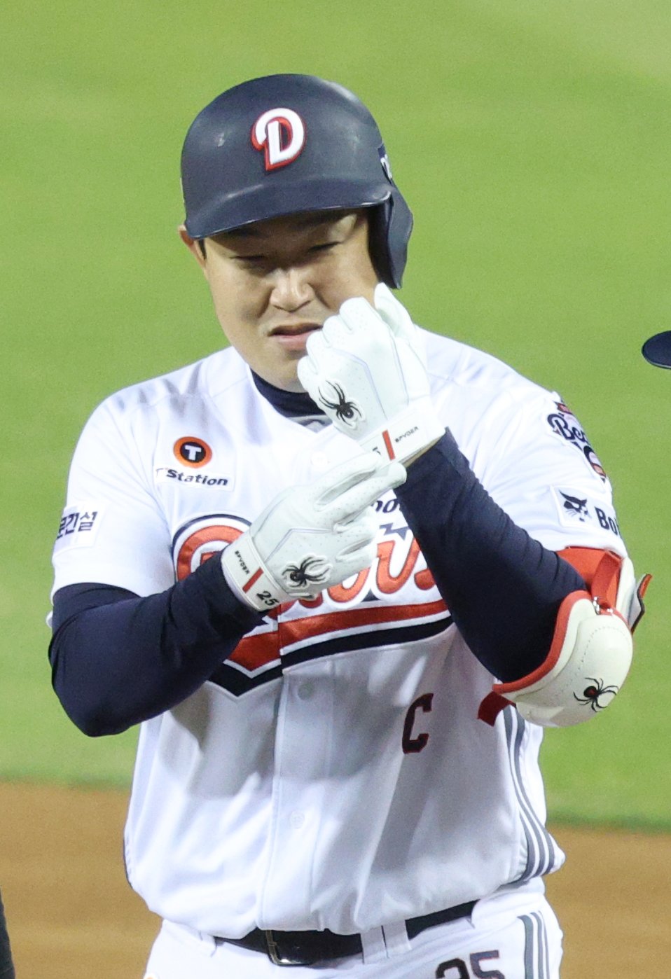 2026 신한 SOL KBO리그 두산 베어스와 키움 히어로즈의 경기가 7일 서울 잠실야구장에서 열렸다. 두산 양의지는 4회말 무사 1루 상황에서 좌전 안타를 쳤다. 안타를 날린 후 출루한 양의지는 세리머니를 했다.