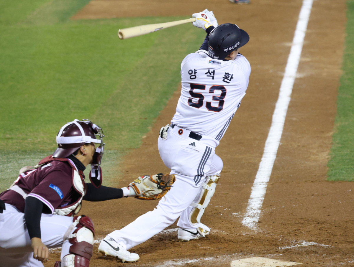 두산 양석환이 4회말 1사 만루에서 동점 1타점 희생 플라이를 날리고 있다.