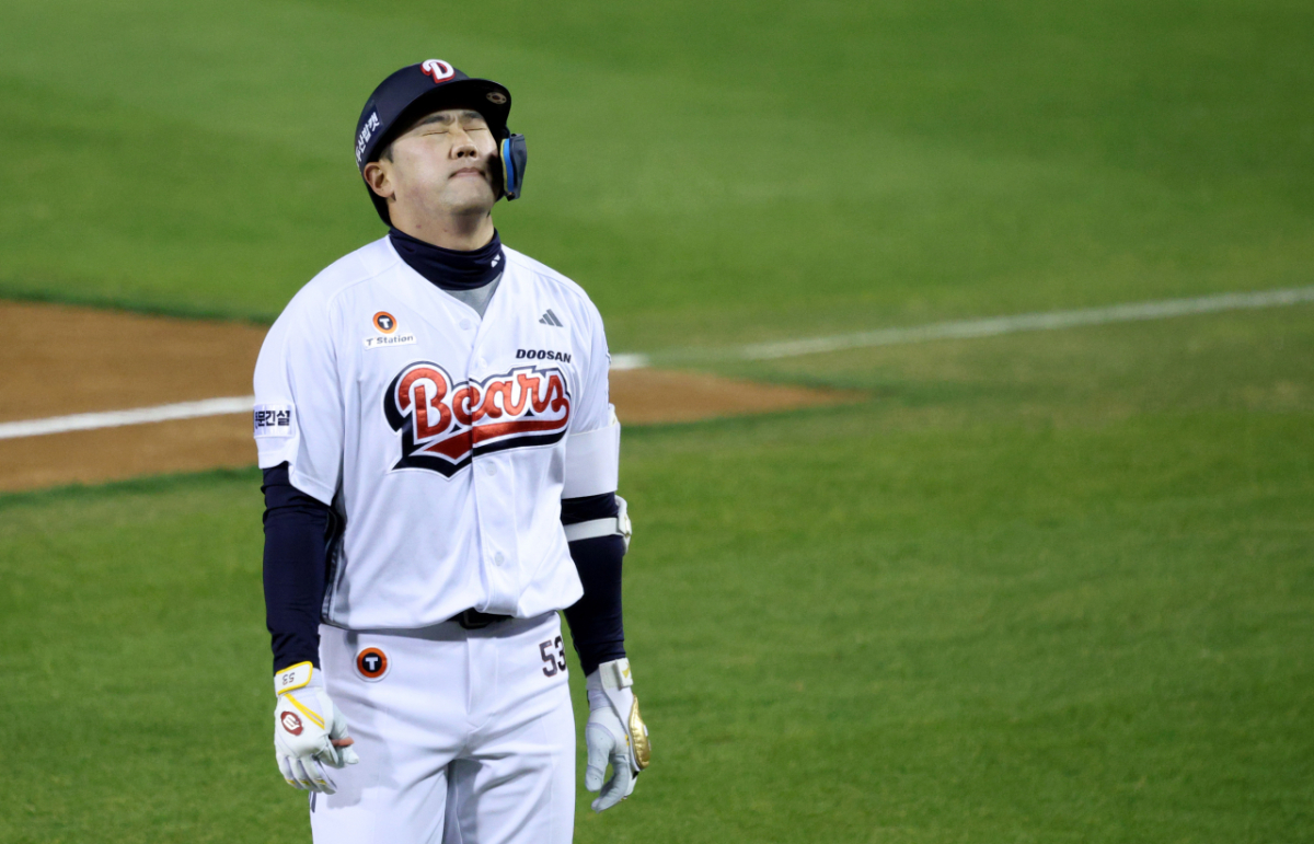 두산 양석환이 4회말 1사 만루에서 작심하고 날린 타구가 동점 1타점 희생 플라이에 그치자 아쉬워하고 있다.