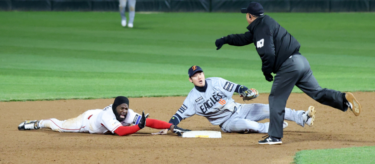 한화 2루수 하주석이 7일 랜더스필드에서 열린 2026KBO리그 한화이글스와 SSG랜더스 시즌 첫 경기 3회말 2사 1루 최정타석 때 2루 도루를 시도하던 에레디아를 태그아웃시키고 있다. 2026.04.07.