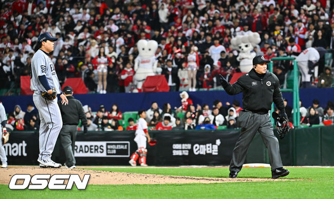 7일 오후 인천 SSG랜더스필드에서 2026 신한 SOL Bank KBO리그 SSG 랜더스와 한화 이글스의 경기가 진행됐다. 이날 SSG는 타케다를, 한화는 류현진을 선발투수로 내세웠다. 4회말 권영철 구심이 한화 류현진 투수에게 피치클락 위반을 경고했다.