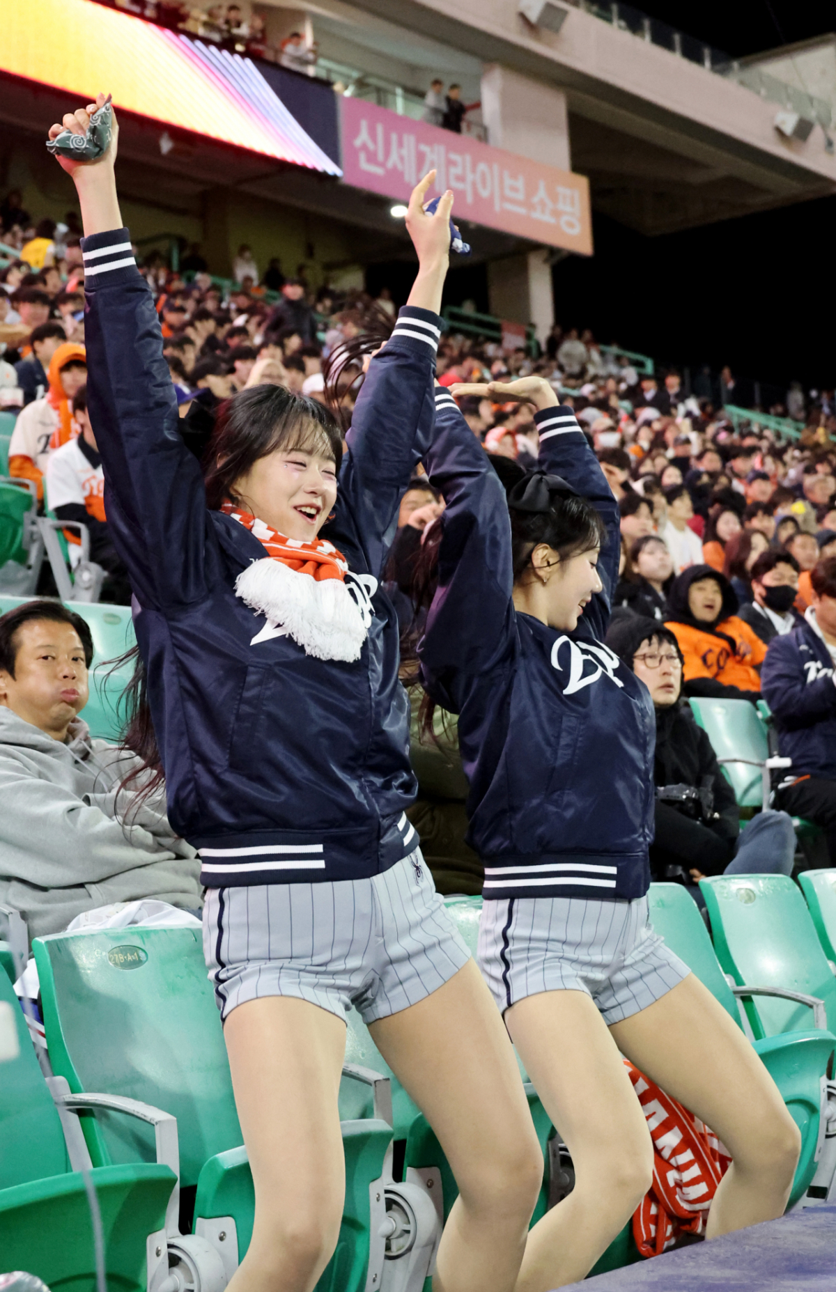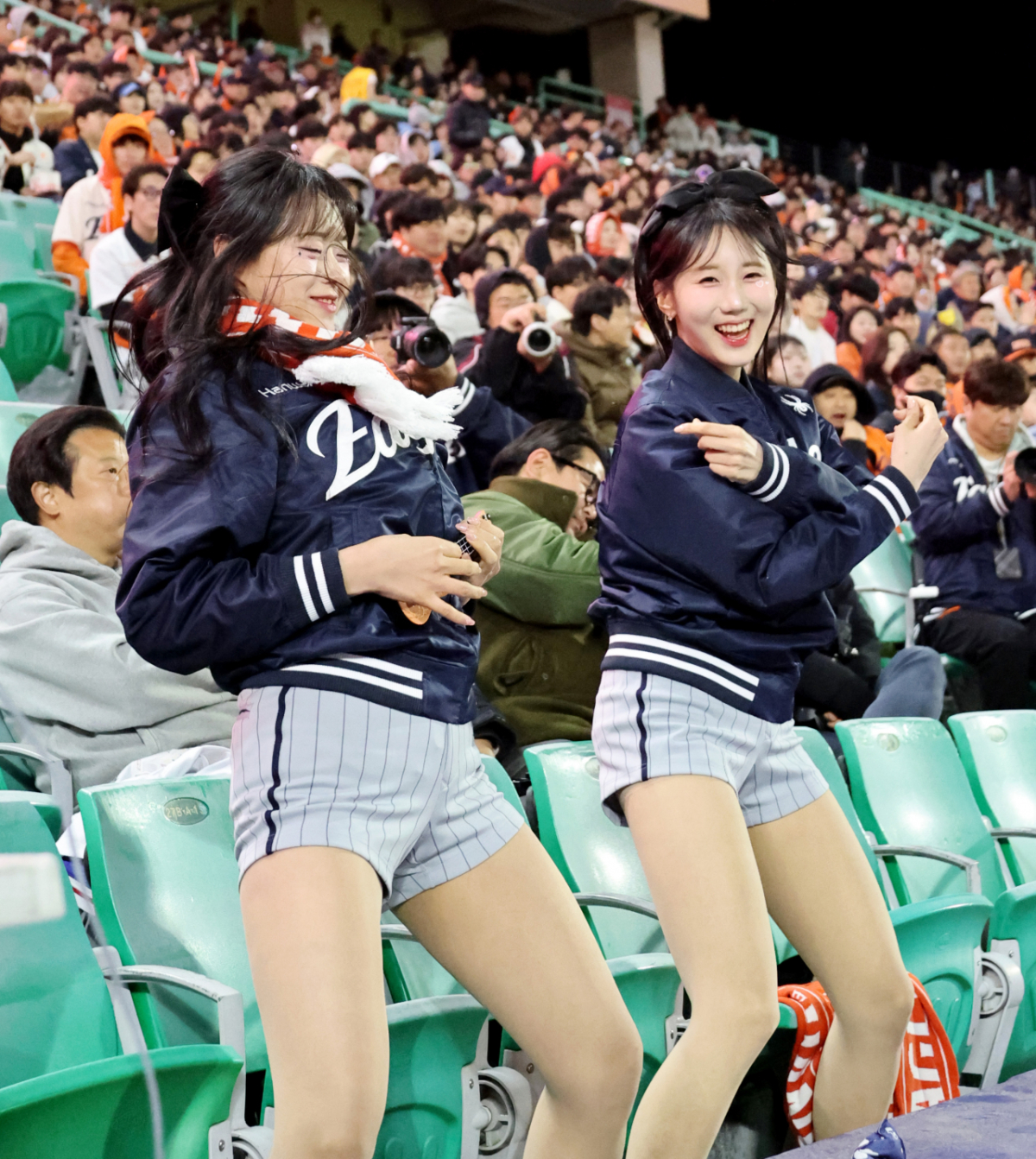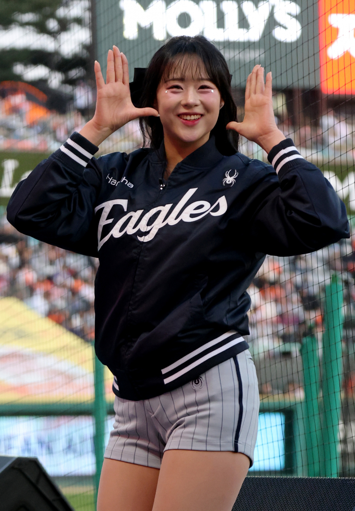 한화 치어리더 이호은이 7일 랜더스필드에서 열린 2026KBO리그 한화이글스와 SSG랜더스 시즌 첫 경기에서 아웃송을 열연하고 있다. 2026.04.07.