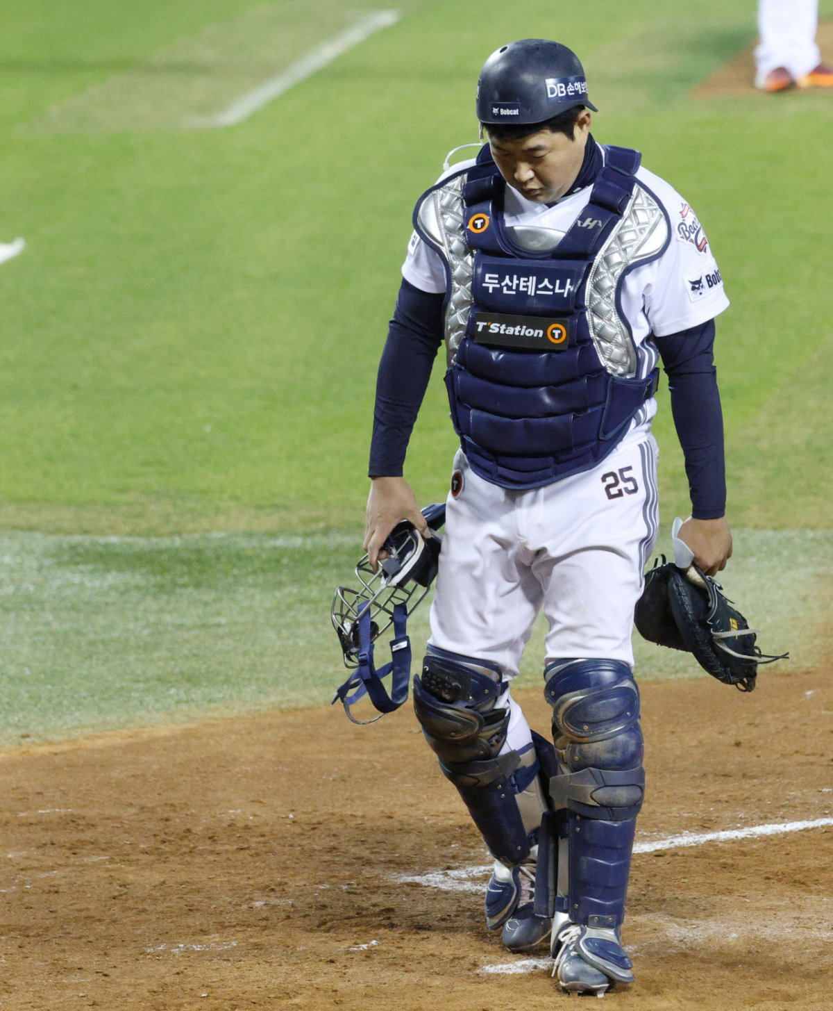 두산 포수 양의지가 키움 6회초 1사 2,3루에서 3루주자 이형종의 스트라이크 낫아웃 때 역전을 허용한 후 고개를 떨구고 있다.