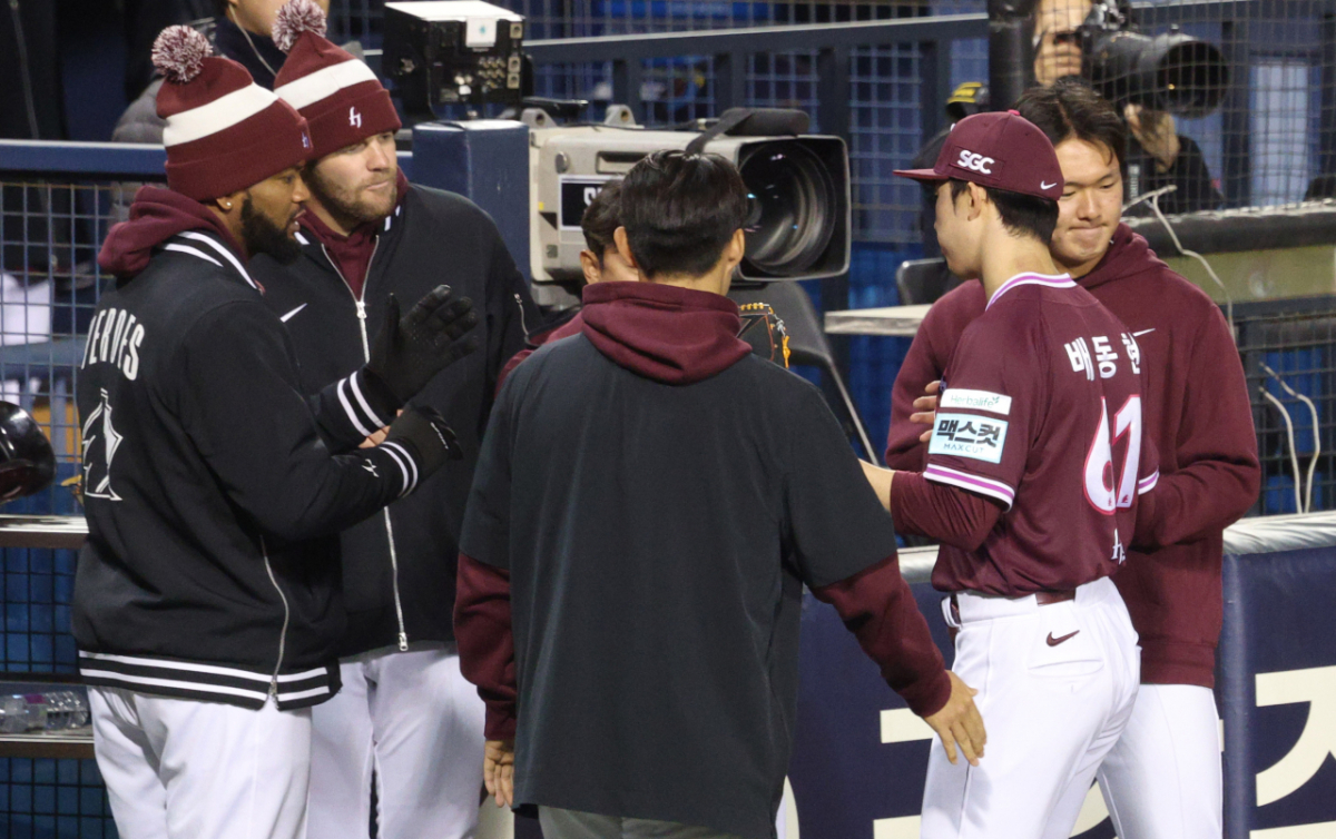 2026 신한 SOL KBO리그 두산 베어스와 키움 히어로즈의 경기가 7일 서울 잠실야구장에서 열렸다. 키움 선발 배동현은 6회 교체되었다. 그는 교체된 후 동료들의 환영을 받았다.