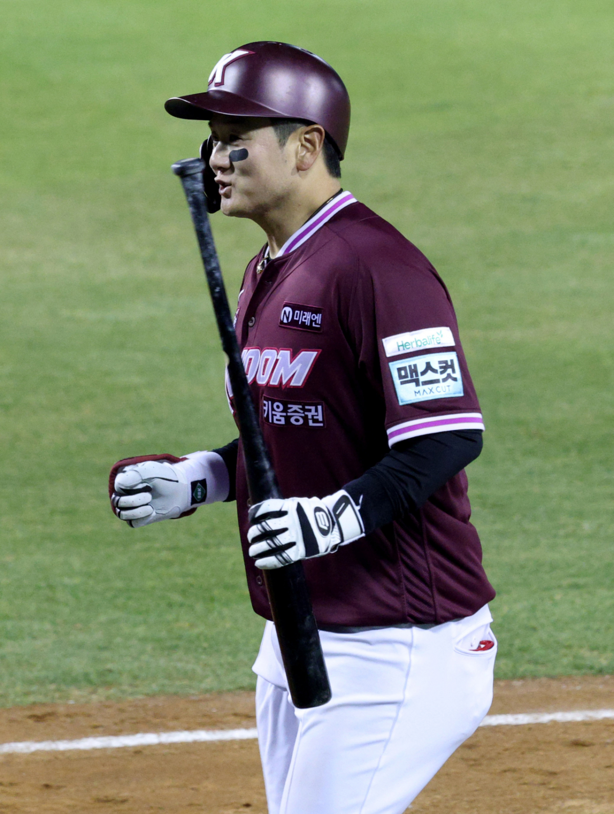 키움 최주환이 7회초 1사 만루에서 1타점 희생 플라이를 날린 후 밝은 표정으로 더그아웃으로 향하고 있다.