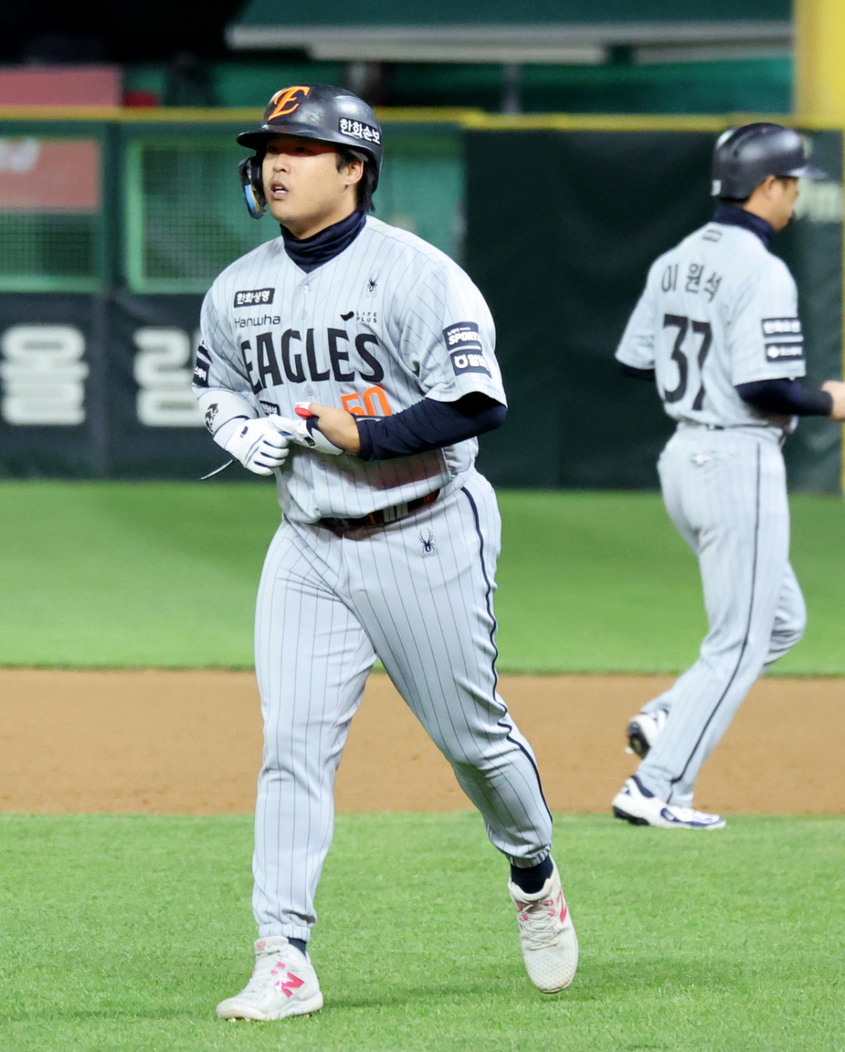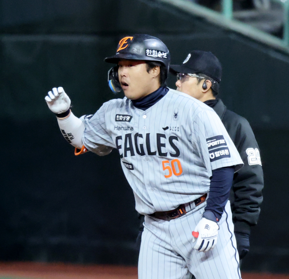 한화 3번타자 강백호가 7일 랜더스필드에서 열린 2026KBO리그 한화이글스와 SSG랜더스 시즌 첫 경기 9회초 1사 1,2루에서 1타점 적시타로 출루한 후 교체되며 더그아웃으로 향하고 있다. 2026.04.07.