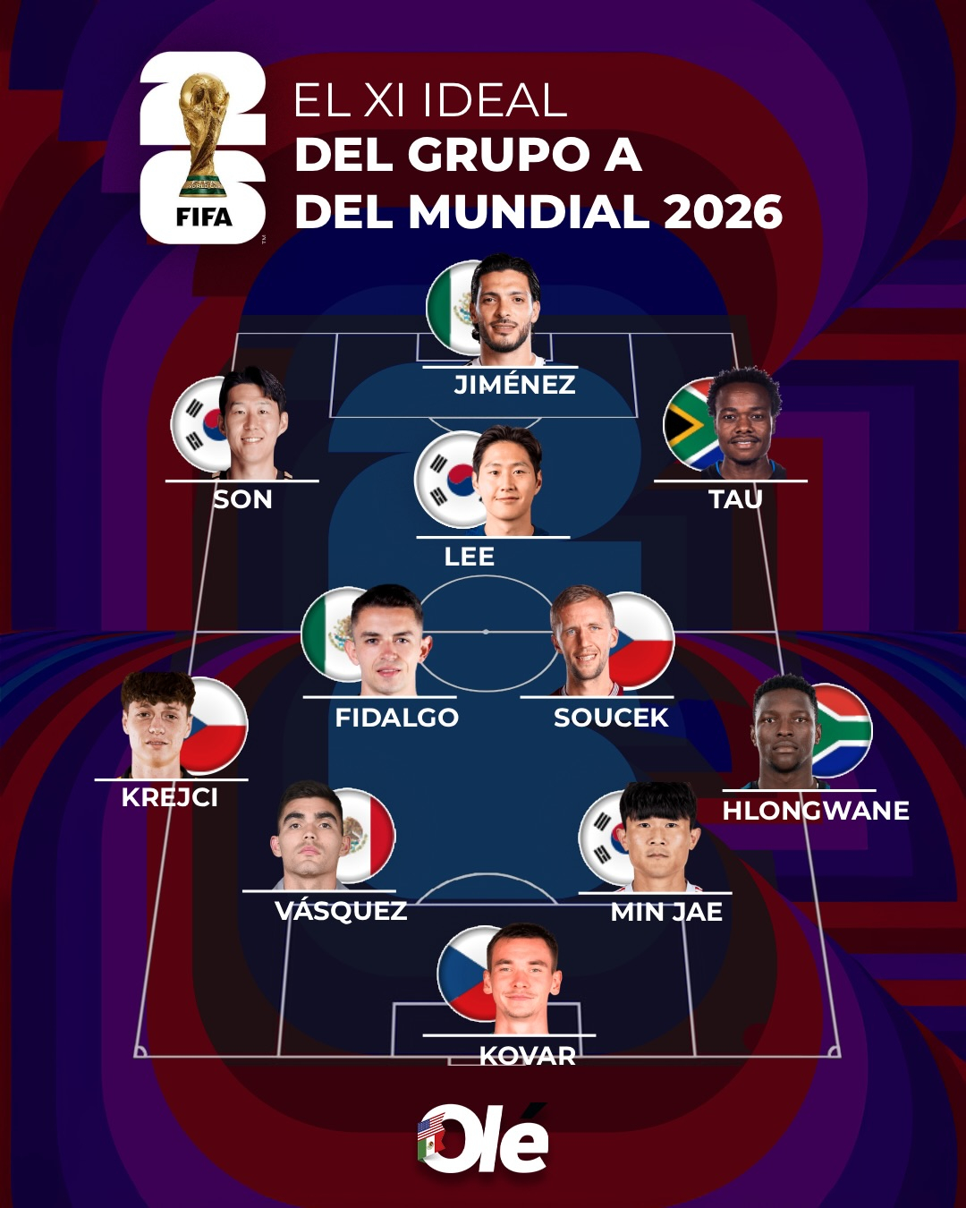 남미 매체 올레는 7일(한국시간) 북중미 월드컵 본선 각 조 통합 베스트11을 선정해 발표했다. 한국과 멕시코, 체코 선수 3명씩, 그리고 남아프리카공화국 2명이 베스트11 자리를 채웠다.