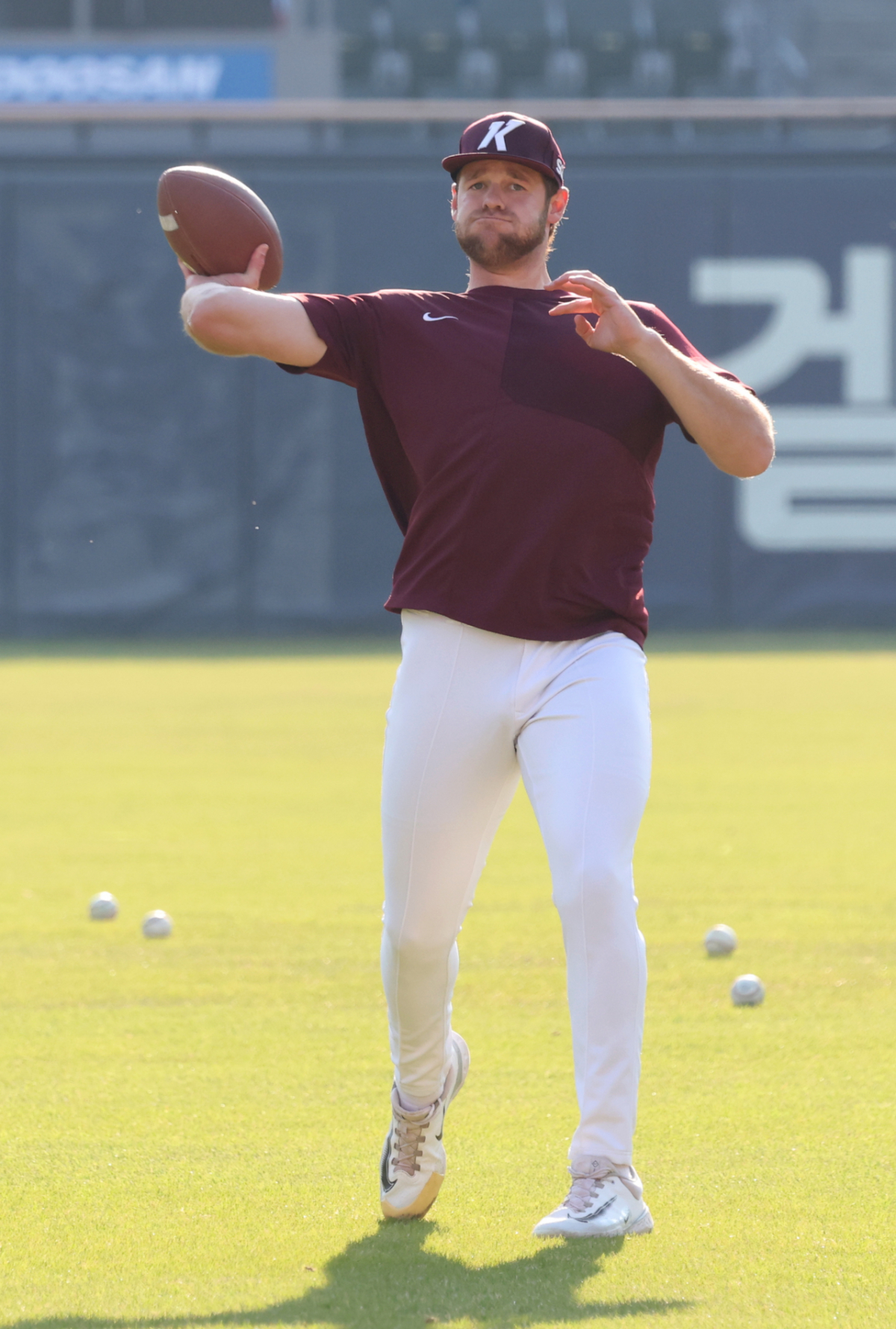 키움 네이션 와일스가 럭비공으로 피칭 훈련을 하고 있다.