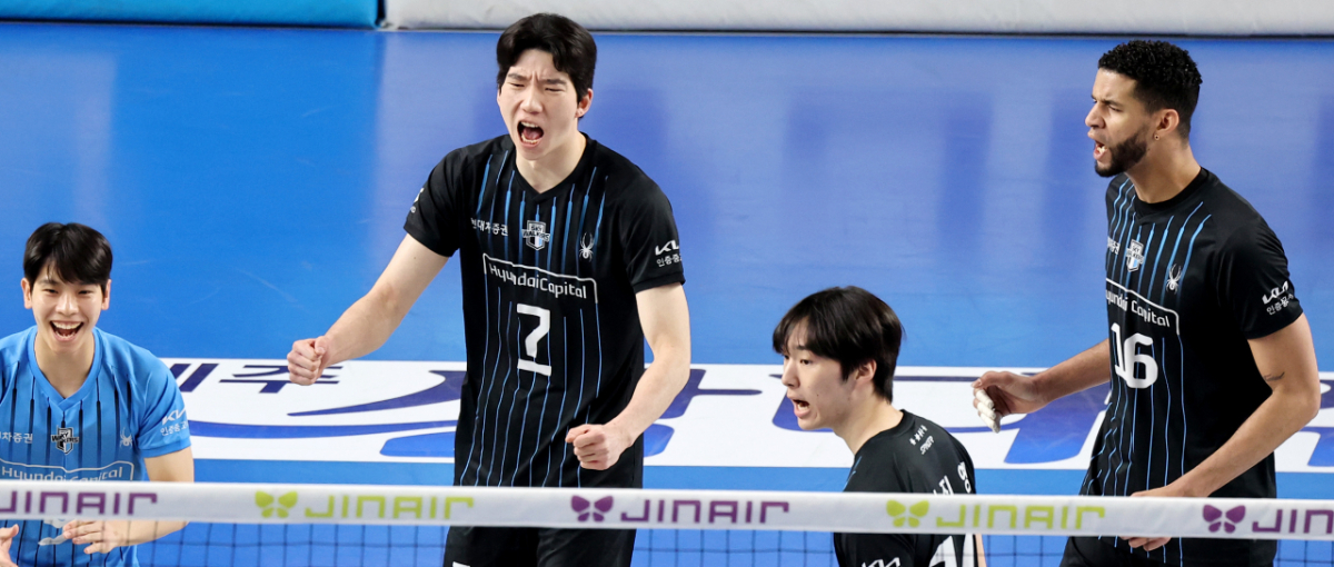 현대 허수봉이 8일 천안유관순체육관에서 열린 진에어 2025-2026 V리그 챔피언결정전 대한항공과 현대캐피탈 4차전에서 득점했다. 그는 득점 후 환호했다. 이 경기는 2026년 4월 8일에 진행됐다.
