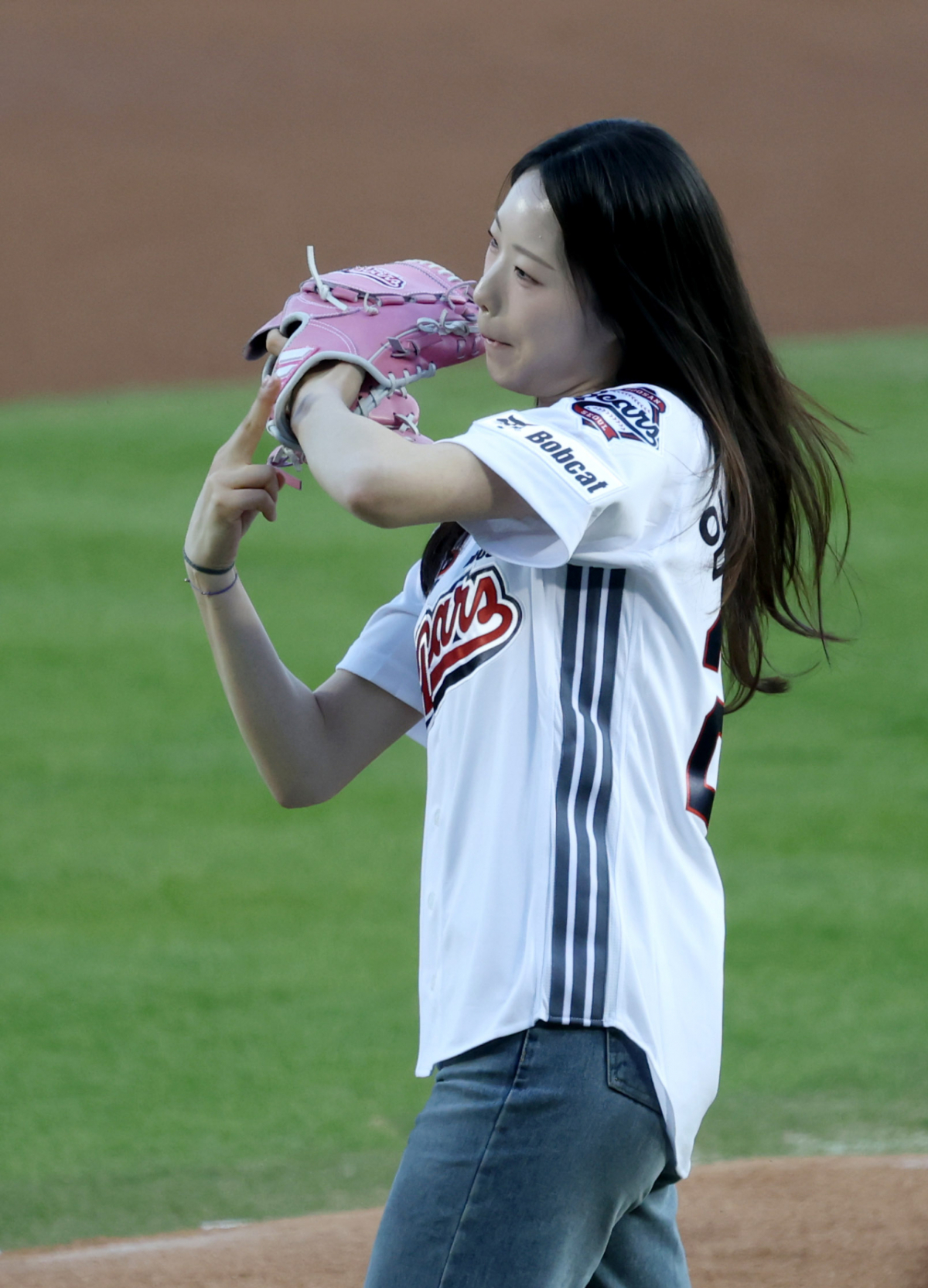 스피드스케이팅 국가대표 임리원이 두산 승리기원 시구를 하고 있다.