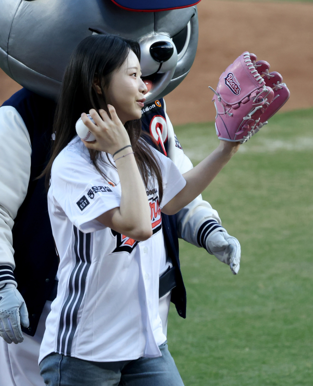 스피드스케이팅 국가대표 임리원이 두산 승리기원 시구를 하고 있다.