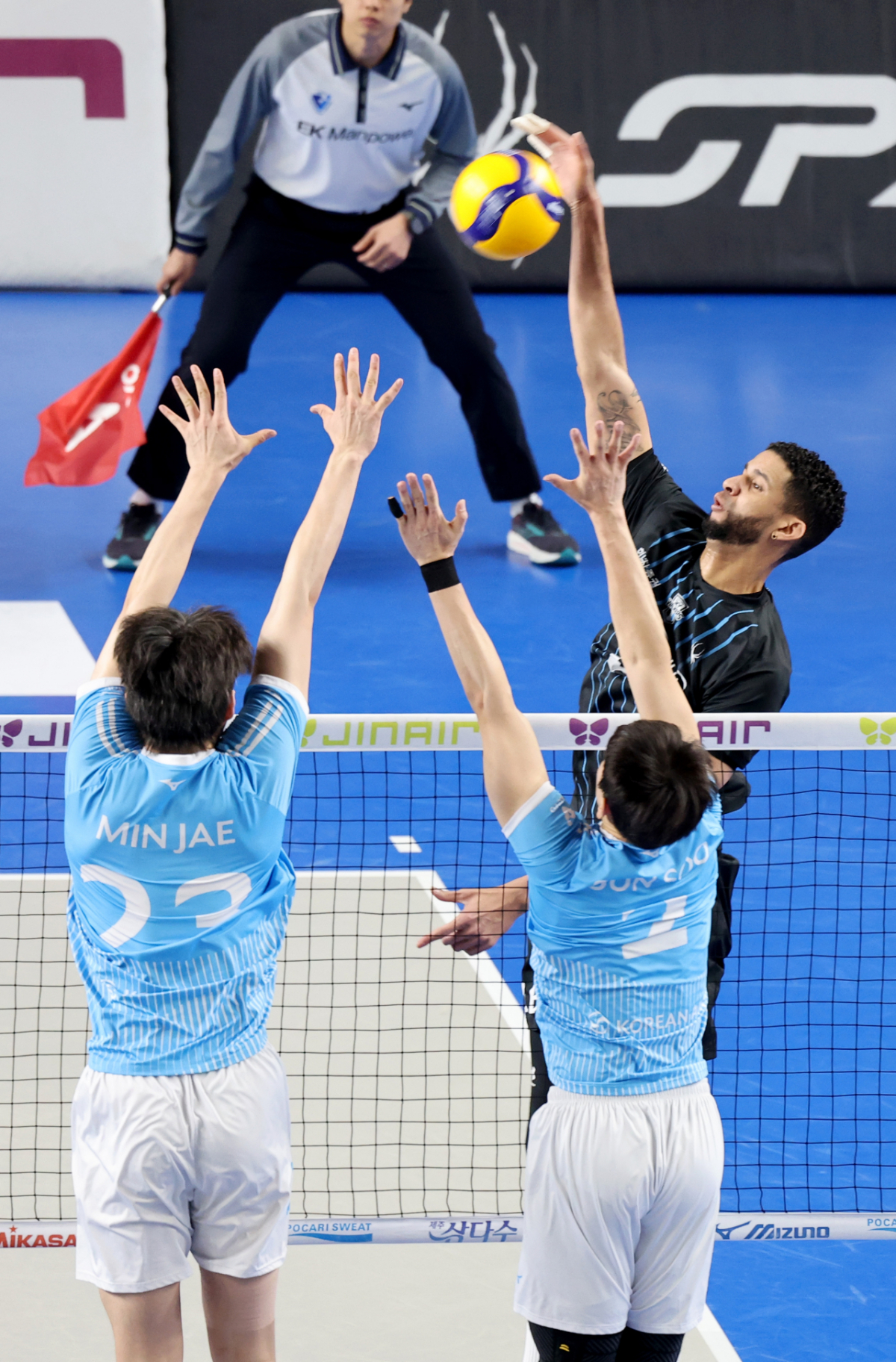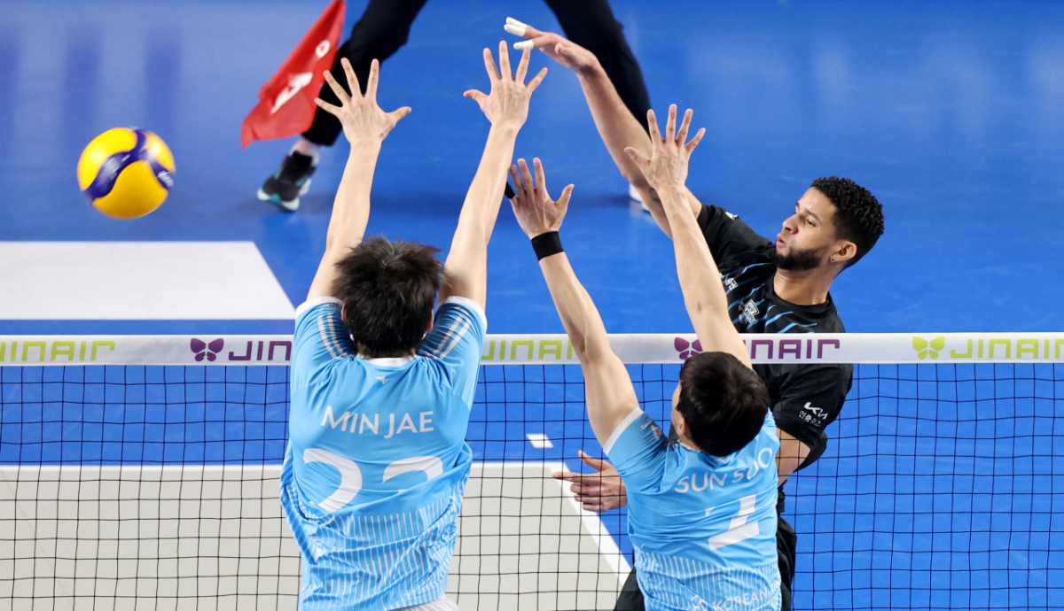 현대 레오가 8일 천안유관순체육관에서 열린 진에어 2025-2026 V리그 챔피언결정전 대한항공과 현대캐피탈 4차전에서 대한항공 이중블로킹을 피해 강타를 시도하고 있다. 2026.04.08.