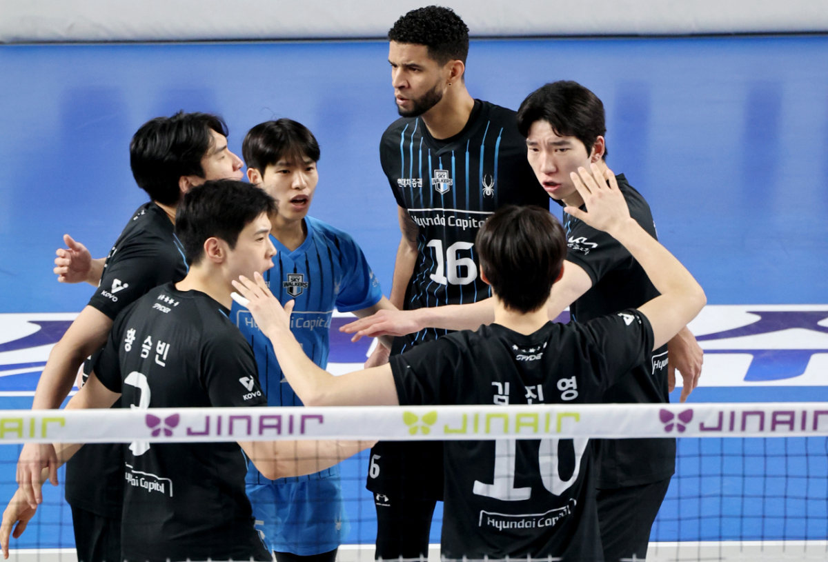 현대 레오가 8일 천안유관순체육관에서 열린 진에어 2025-2026 V리그 챔피언결정전 대한항공과 현대캐피탈 4차전에서 득점한후 자축하고 있다. 2026.04.08.