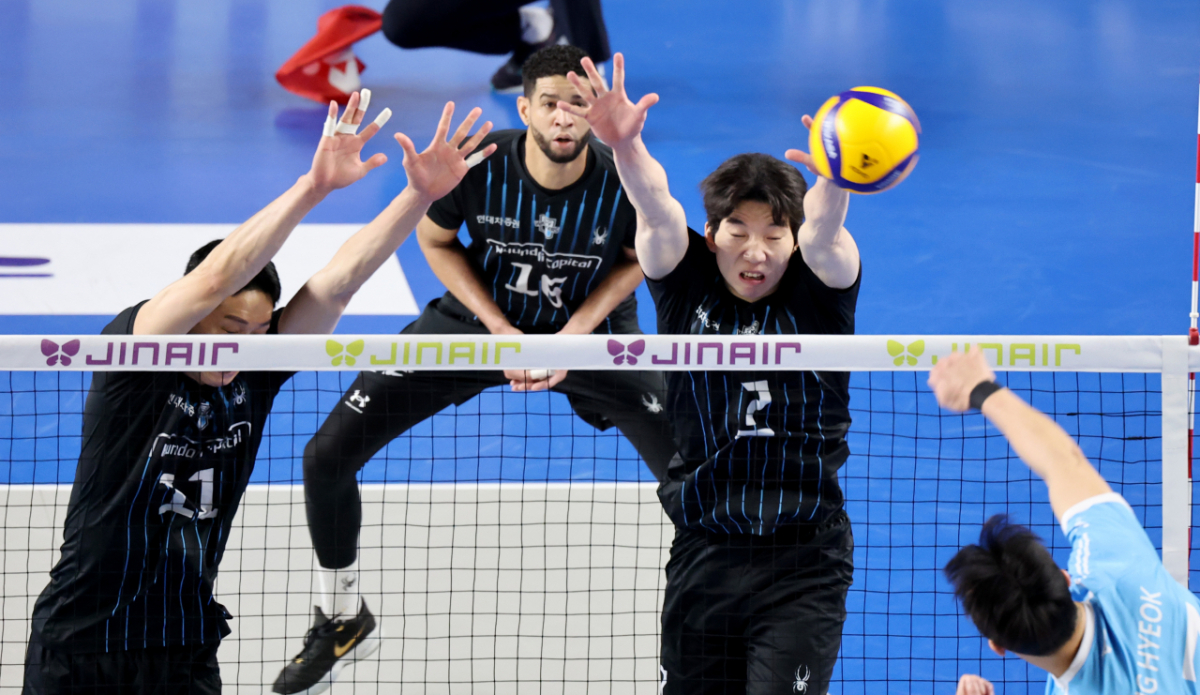 현대 허수봉이 8일 천안유관순체육관에서 열린 진에어 2025-2026 V리그 챔피언결정전 대한항공과 현대캐피탈 4차전에서 대한항공 정지석의 강타를 막아냈다. 이 경기는 천안유관순체육관에서 진행되었다. 허수봉은 정지석의 공격을 막아내는 모습을 보였다.