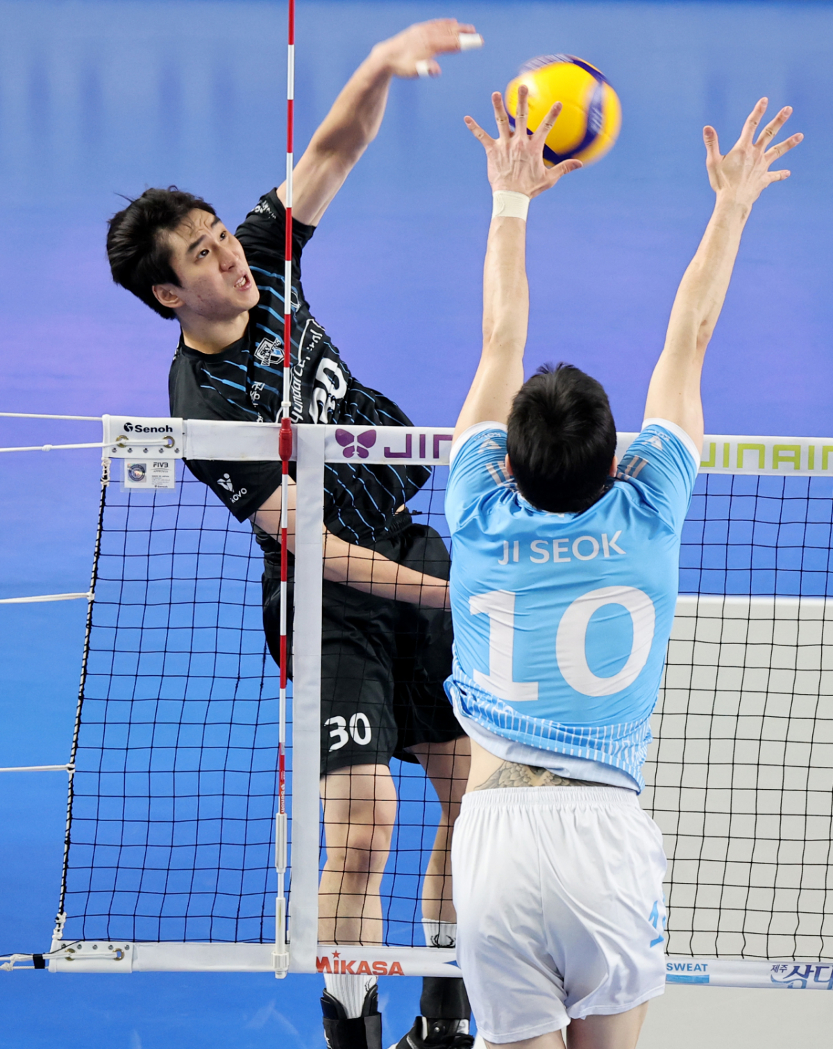 현대 신호진이 8일 천안유관순체육관에서 열린 진에어 2025-2026 V리그 챔피언결정전 대한항공과 현대캐피탈 4차전에서 대한항공 정지석 블로킹에 강타를 터트리고 있다. 2026.04.08.