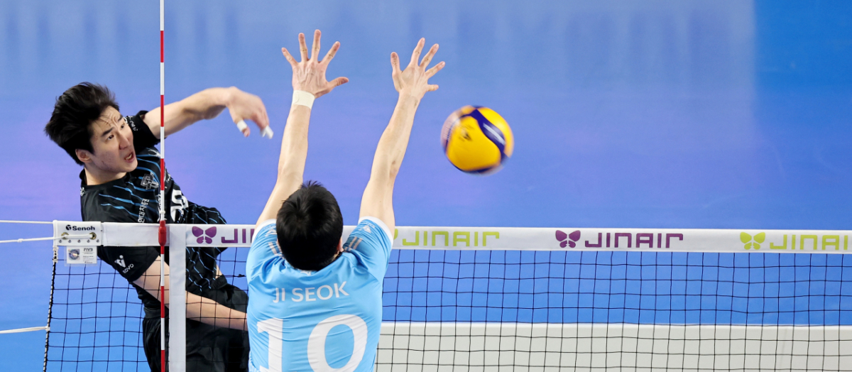 현대 신호진이 8일 천안유관순체육관에서 열린 진에어 2025-2026 V리그 챔피언결정전 대한항공과 현대캐피탈 4차전에서 강타를 터트렸다. 신호진은 대한항공 정지석의 블로킹을 피해 강타를 날렸다. 이 경기는 2026년 4월 8일에 진행되었다.