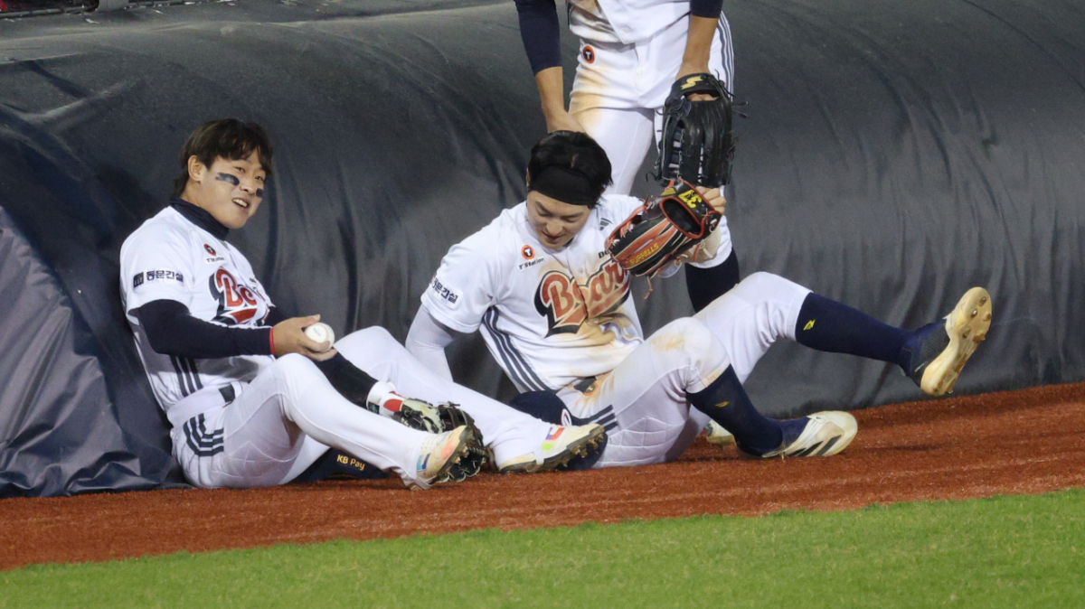 두산 박찬호와 박지훈이 5회초 2사 만루에서 이주형의 파울 타구를 잡으려다 충돌하며 놓친 후 아쉬워하고 있다.