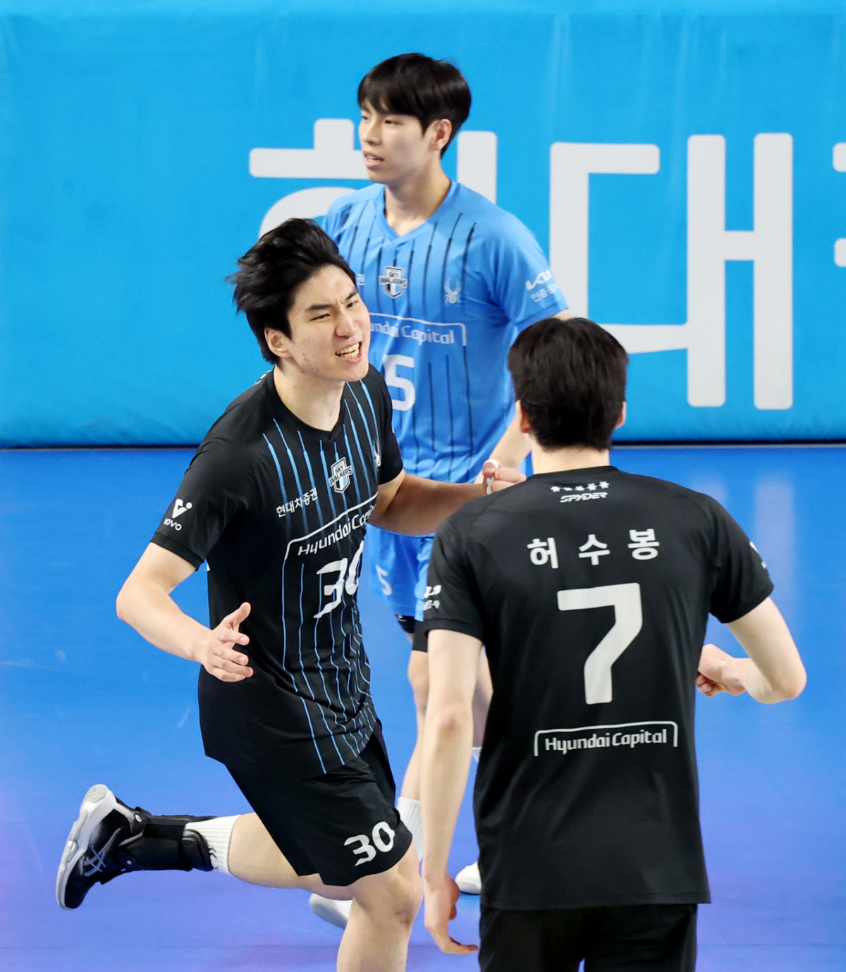 현대 신호진이 8일 천안유관순체육관에서 열린 진에어 2025-2026 V리그 챔피언결정전 대한항공과 현대캐피탈 4차전에서 환호하고 있다. 2026.04.08.