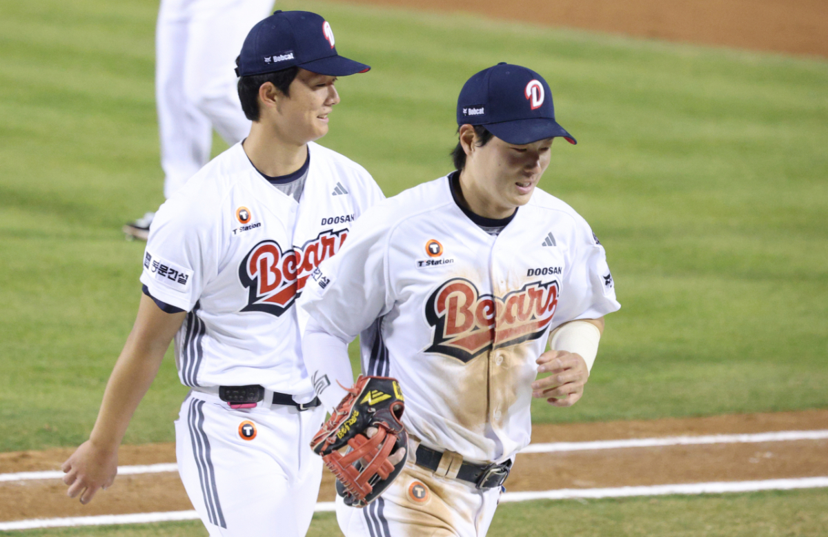 두산 선발 최민석이 5회 투구를 마친 후 밝은 표정으로 더그아웃으로 향하고 있다.