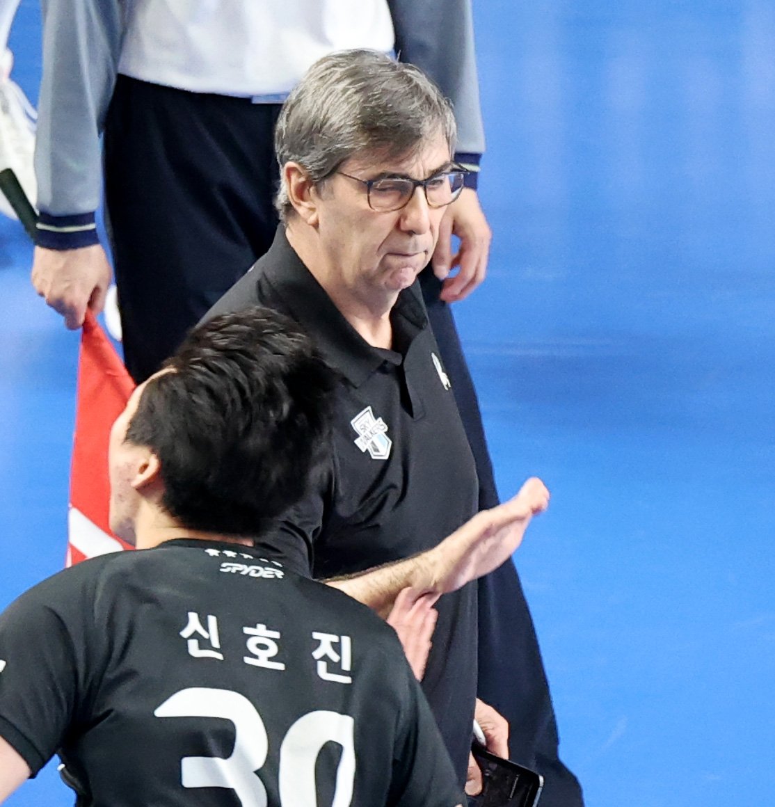 현대 신호진이 8일 천안유관순체육관에서 열린 진에어 2025-2026 V리그 챔피언결정전 대한항공과 현대캐피탈 4차전에서 득점했다. 신호진은 득점 후 블랑 감독과 자축했다. 이 경기는 2026년 4월 8일에 진행됐다.