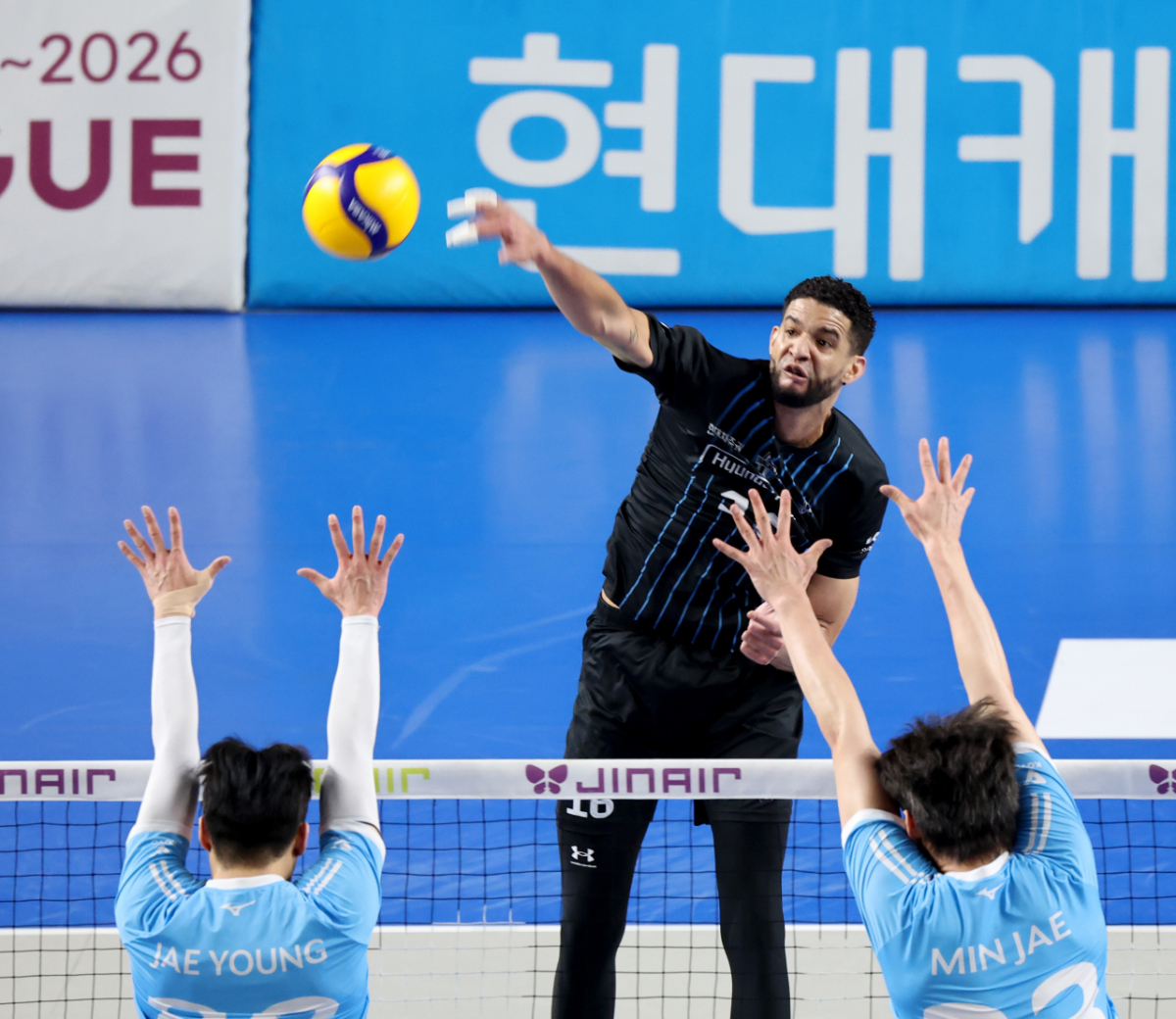 현대 레오가 8일 천안유관순체육관에서 열린 진에어 2025-2026 V리그 챔피언결정전 대한항공과 현대캐피탈 4차전에서 후위공격을 시도하고 있다. 2026.04.08.