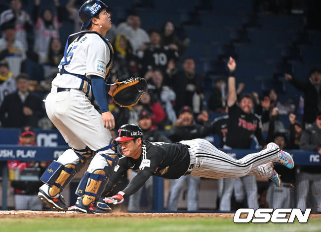 오지환이 류진욱 상대로 2볼에서 148km 직구를 때렸다. 잘 맞은 타구는 한가운데 펜스 상단을 맞고 나왔다. 중견수 최정원이 점프 캐치를 시도했으나 실패했고, 그라운드에 쓰러졌다. 펜스를 맞은 타구가 튕겨 나왔고, 넘어졌던 최정원이 일어나서 달려가 타구를 잡기까지 시간이 걸렸다.