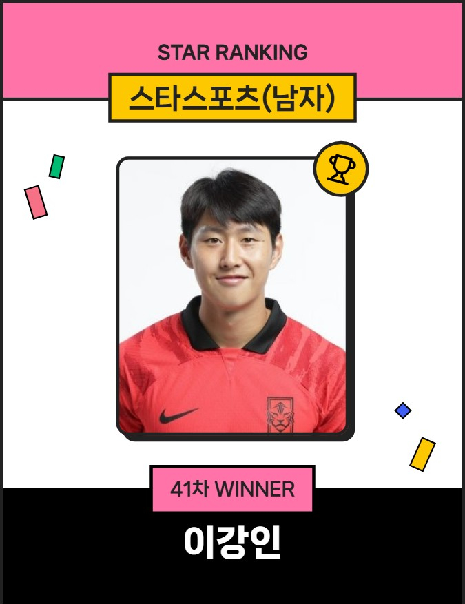 이강인은 지난 2일 오후 3시 1분부터 9일 오후 3시까지 집계된 스타랭킹 스타스포츠 남자 41차 투표에서 1만 4530표를 획득하며 1위에 올랐다. 지난 38차 투표에서 처음으로 1위에 등극한 이후 한 달 내내 단 한 번도 선두 자리를 내주지 않는 압도적인 인기를 과시했다.