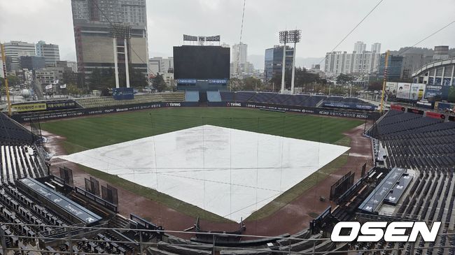 9일 창원 NC파크. 대형 방수포가 깔려 있고, 그라운드는 내리는 비에 젖고 있다. 이날 오전 11시부터 비가 쏟아졌고, NC파크 외야 워닝트랙에는 물웅덩이가 생겼다. 계속해서 많은 비 예보가 밤 늦게까지 있어, 오후 4시가 되기 전에 우천 취소가 결정됐다.