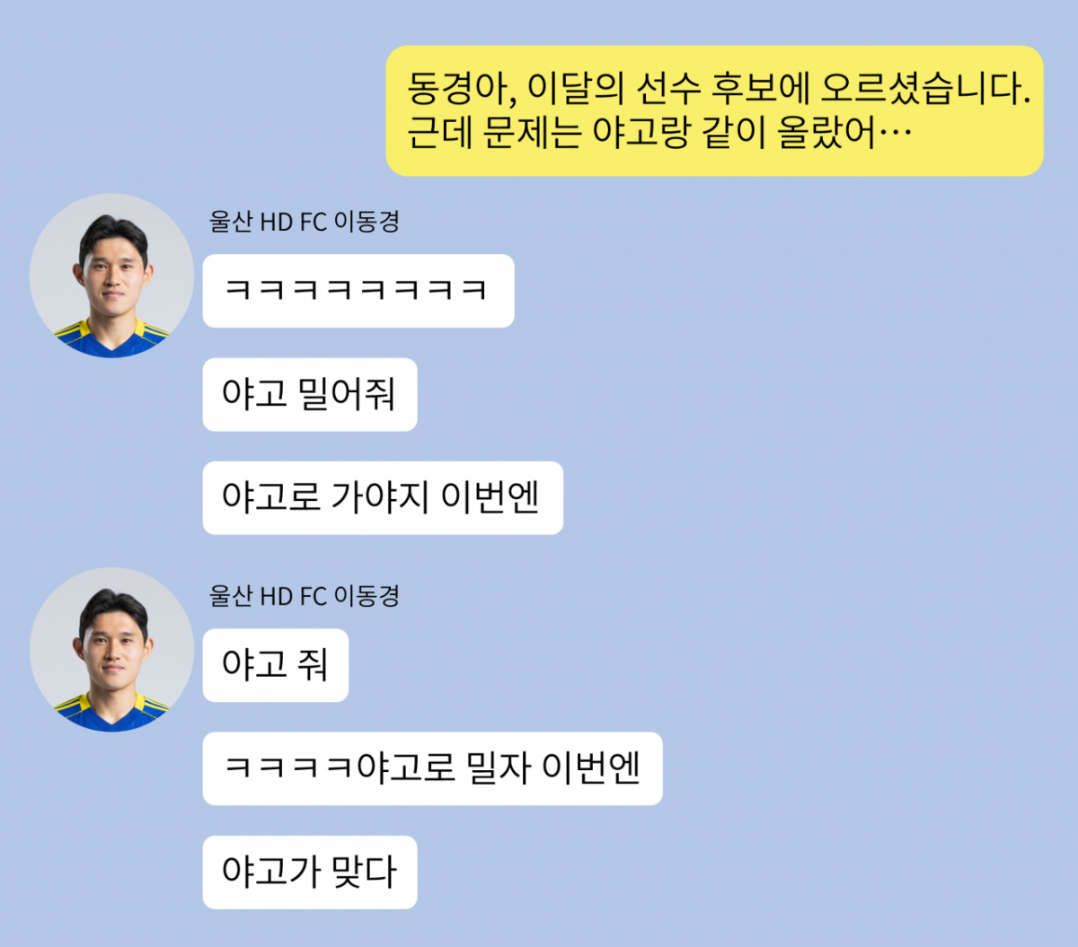 9일 구단이 공개한 메시지에 따르면 이동경은 "투표가 분산되면 안 된다. 이번에는 무조건 야고가 받는 것이 맞고, 받아야 한다"라며 본인의 욕심을 완전히 내려놓는 모습을 보였다. 이미 모든 영광을 누려본 선수의 여유를 넘어, 동료의 상승세를 진심으로 인정하고 팀의 분위기를 먼저 생각하는 부주장의 리더십이 돋보이는 대목이다. 지난 시즌 MVP가 직접 차기 수상자로 야고를 '지명'한 셈이다.