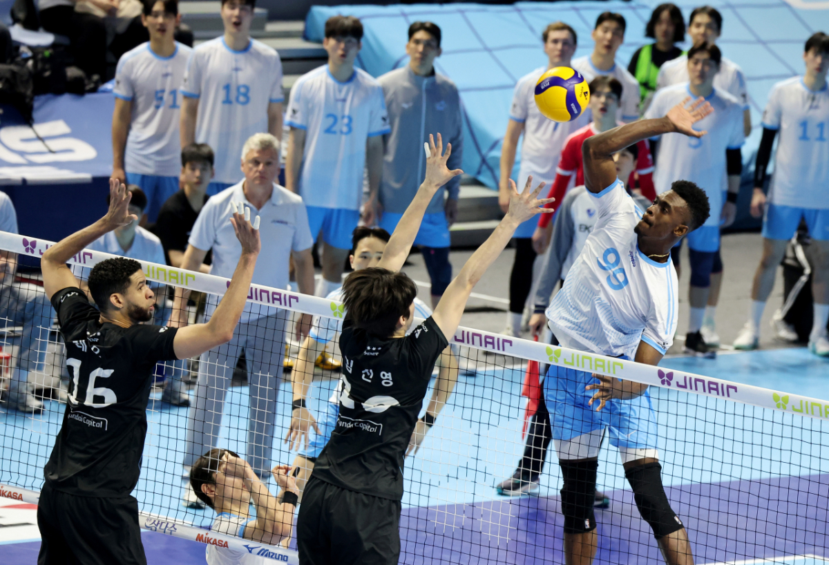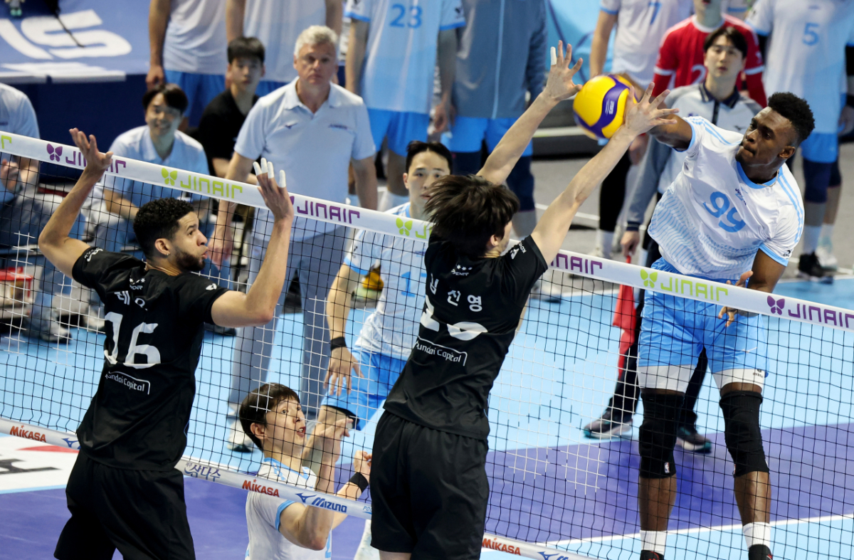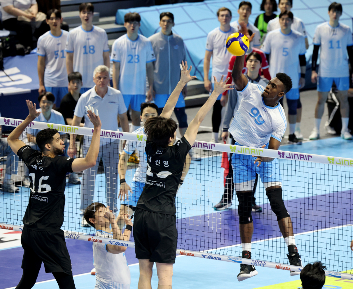 대한항공 마쏘가 10일 인천 계양체육관에서 열린 진에어 2025-2026 V리그 챔피언결정전 대한항공과 현대캐피탈 5차전에서 공격을 성공했다. 마쏘는 레오와 김진영의 이중블로킹을 따돌리며 공격을 성공시켰다. 이 경기는 진에어 2025-2026 V리그 챔피언결정전의 5차전이었다.